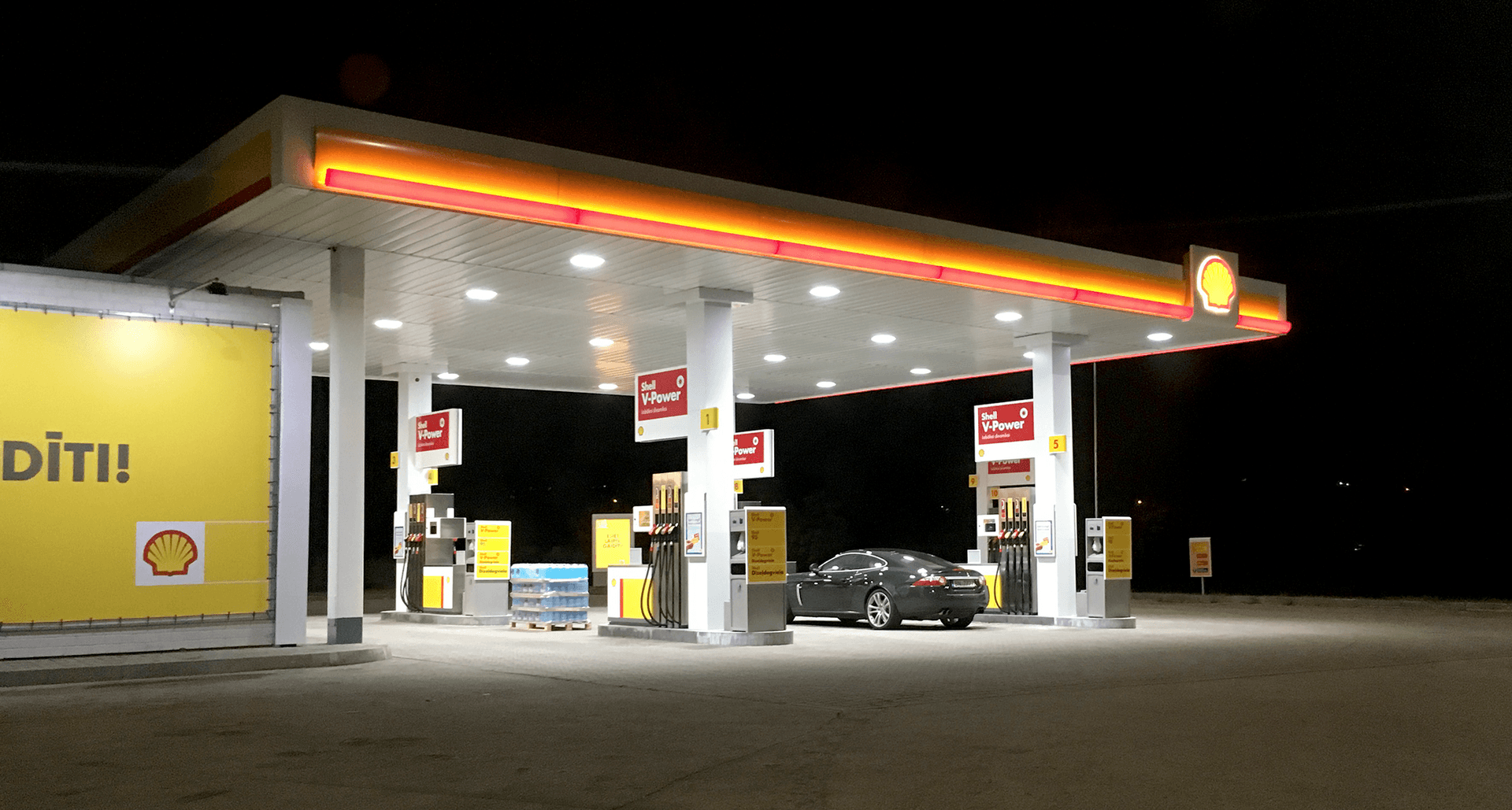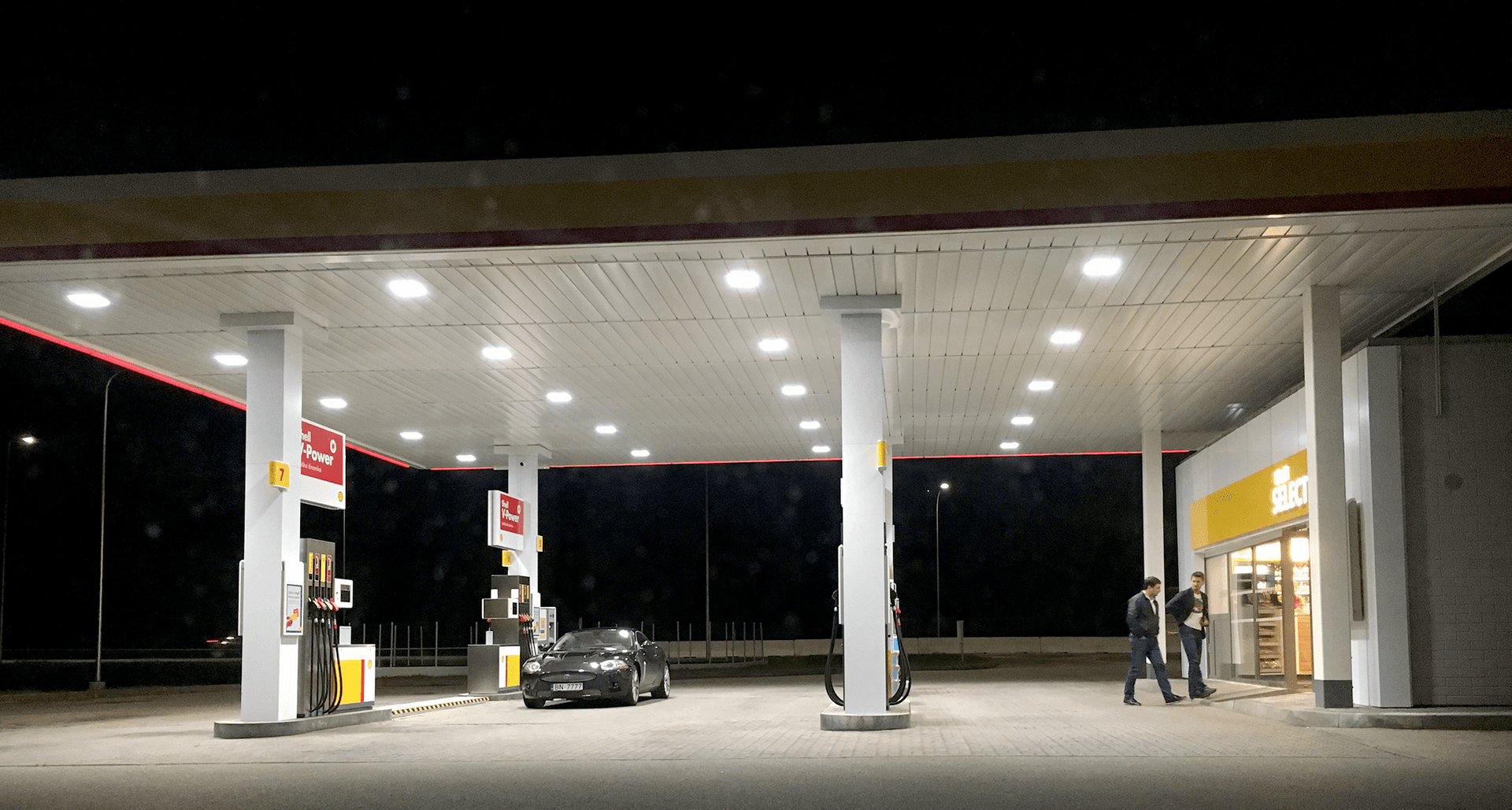 На АЗС SHELL установлены управляемые модификации светильников INSEL LB/R LED со встроенным датчиком движения. При отсутствии автомобилей и людей в зоне ТРК светильники работают в дежурном режиме. При подъезде автомобиля к ТРК светильники включаются на 100% номинальную мощность, обеспечивая высокий уровень освещенности.