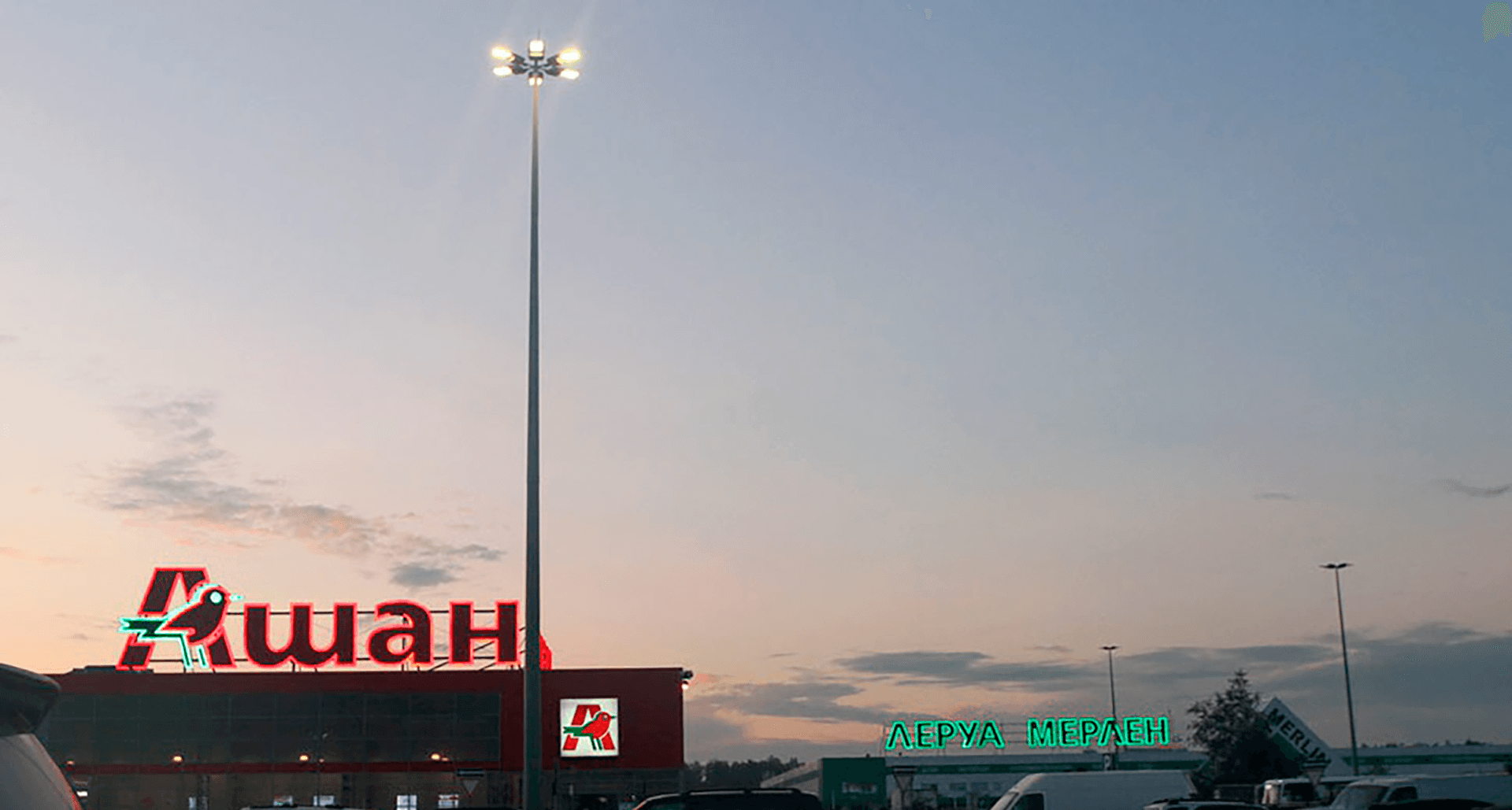 Компания «Световые Технологии» реализовала проект энергоэффективного освещения парковок двух гипермаркетов сети «АШАН». Были заменены устаревшие неэффективные светильники на новые светодиодные.На опорах высотой 20 метров установлены светильники MAGISTRAL LED, на опорах высотой 11 метров - FREGAT LED.Светильники отличаются высокими эксплуатационными характеристиками, среди которых: высокая устойчивость к атмосферным воздействиям (IP66 и гарантированная работоспособность при широком диапазоне температур от -40 до +50 градусов) и ударопрочный корпус. Кроме того, светильники обеих серий отличаются простотой монтажа.Применение светодиодных светильников FREGAT LED и MAGISTRAL LED позволило существенно сократить потребление электроэнергии по сравнению со светильниками на традиционных источниках света. Достигнут заданный уровень освещения. Значительно улучшилось качество освещения и визуальный комфорт для водителей и пешеходов.