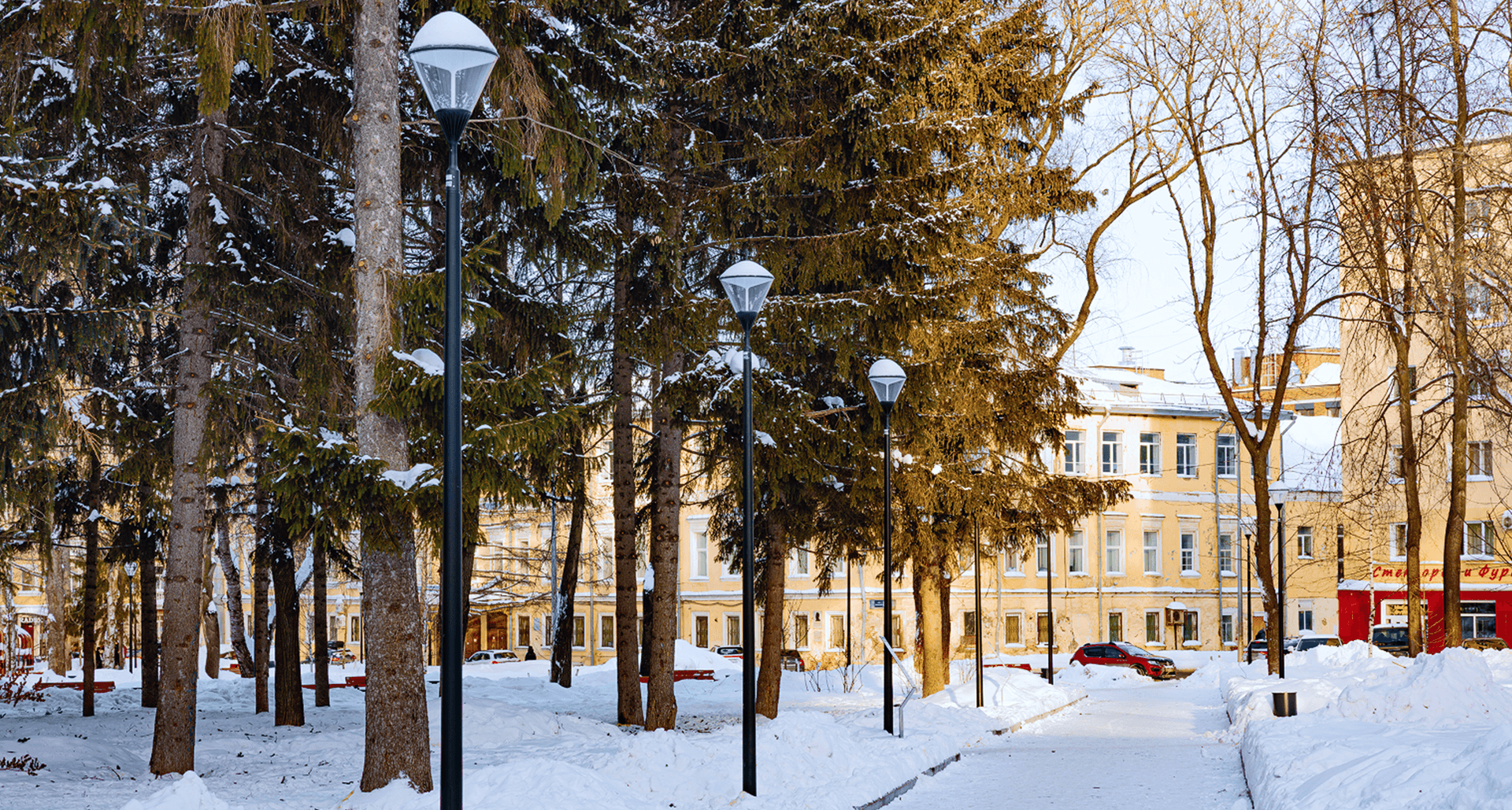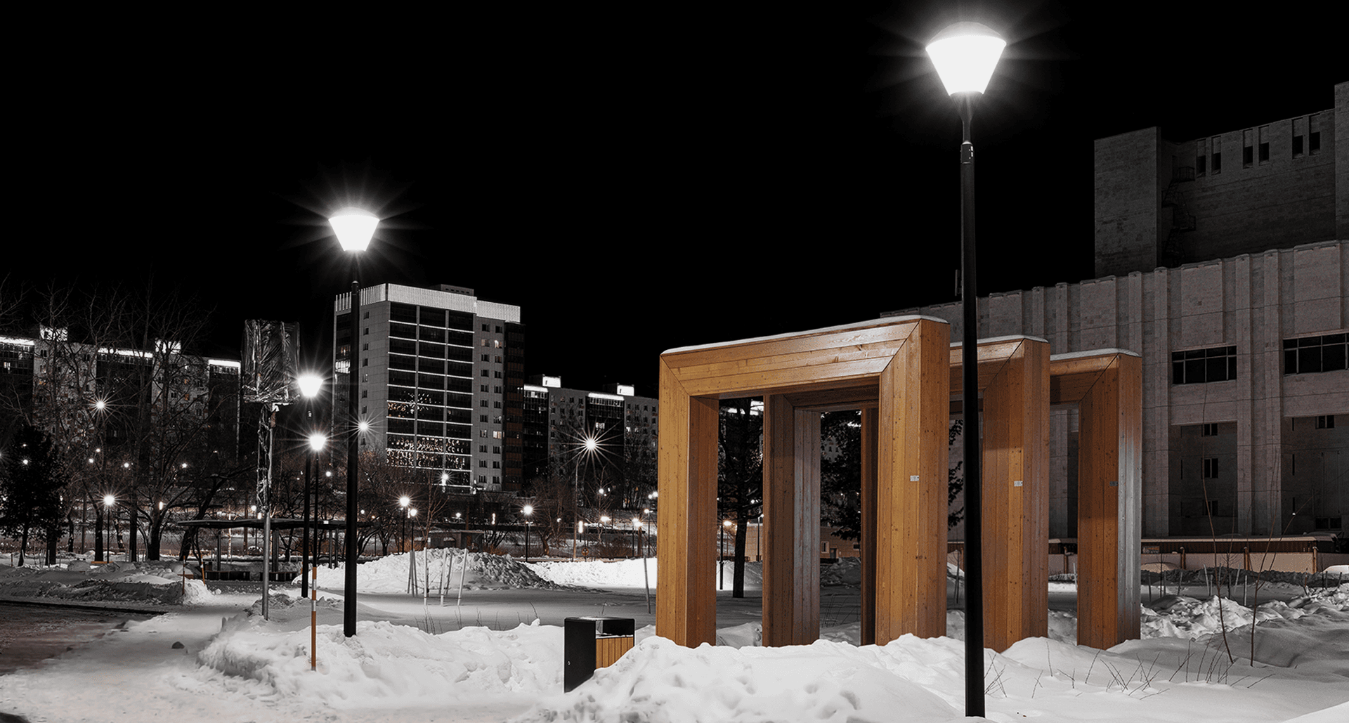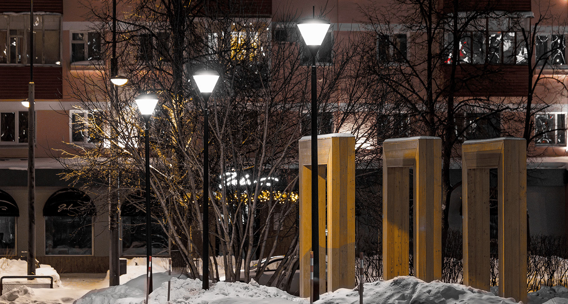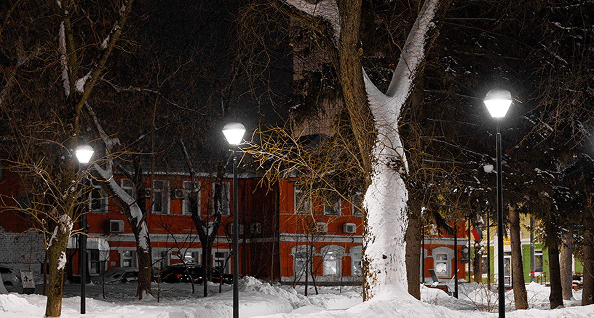 Для этой задачи были выбраны светильники APEX LED с технологией отраженного света и PLC контроллерами. Благодаря им удалось создать мягкое, рассеянное свечение, которое деликатно подчеркивает красоту сада, обеспечивая при этом равномерное освещение и визуальный комфорт для посетителей.