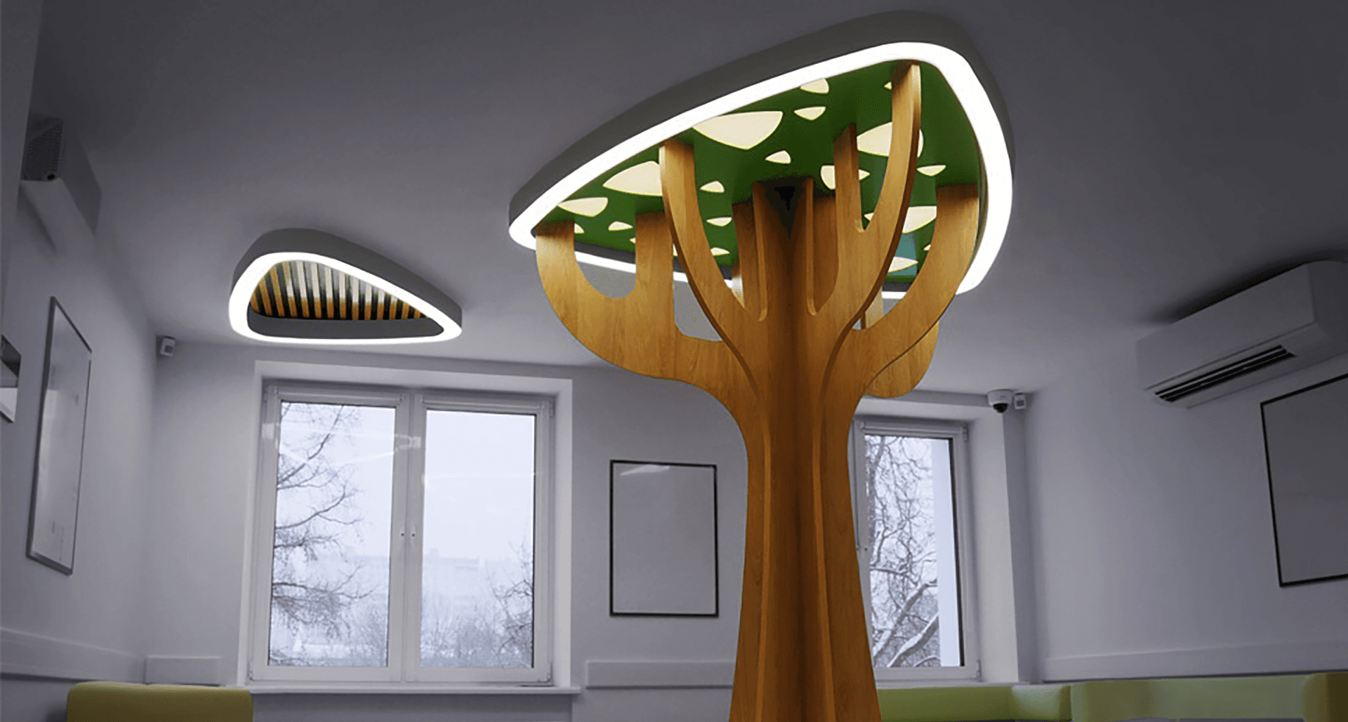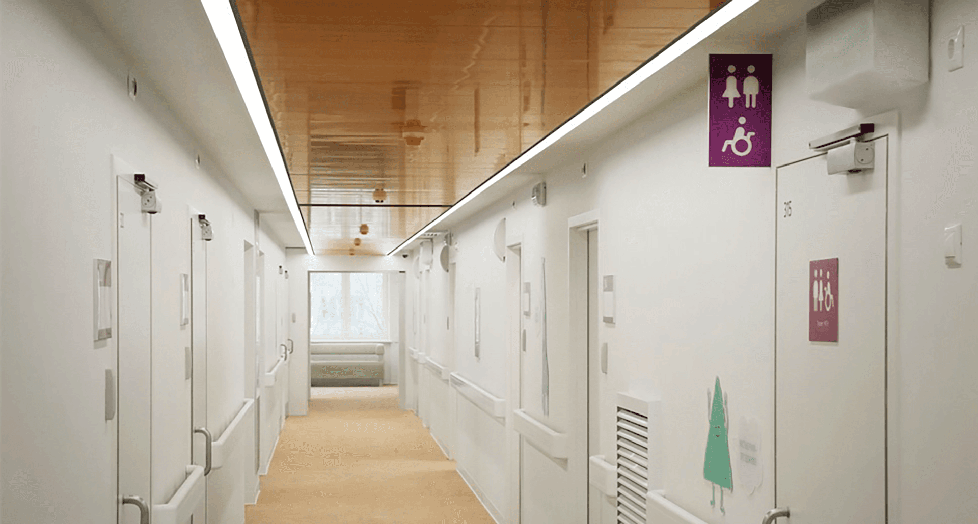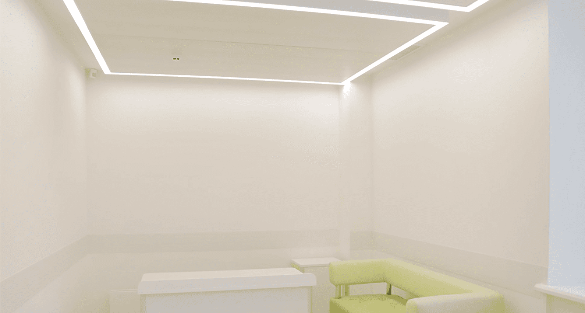 освещение должно быть комфортным для пациентов и медперсонала. Помимо поставок светильников из ассортимента нашей компании, была задача изготовить на заказ светильники согласно дизайн-проекта. Зонирование помещений при помощи освещения.
