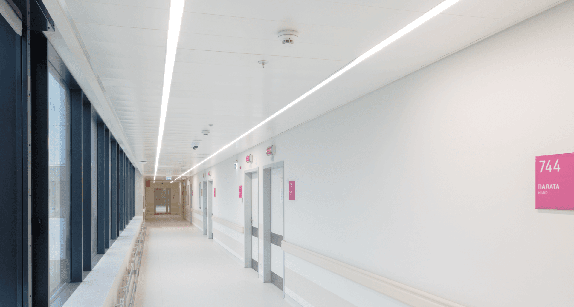 Много деталей, невидимых на первый взгляд, но крайне значимых для комфорта пациентов. Вот пример: на потолке в коридорах светильники размещены в непрерывную линию, поскольку согласно исследованиям, мерцание прерывистых светильников могут разволновать пациента, которого везут на медицинской каталке и он вынужденно смотрит вверх.