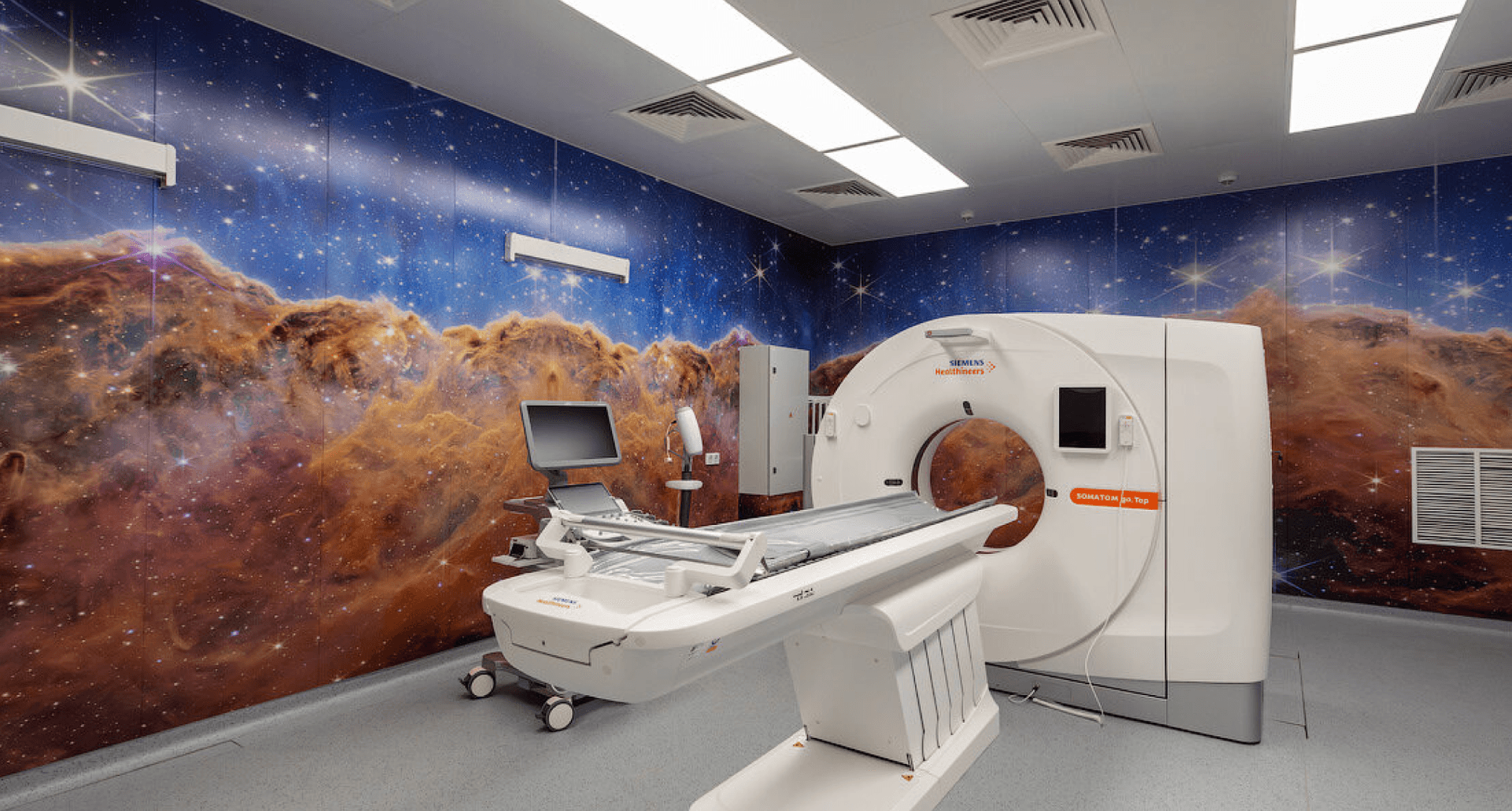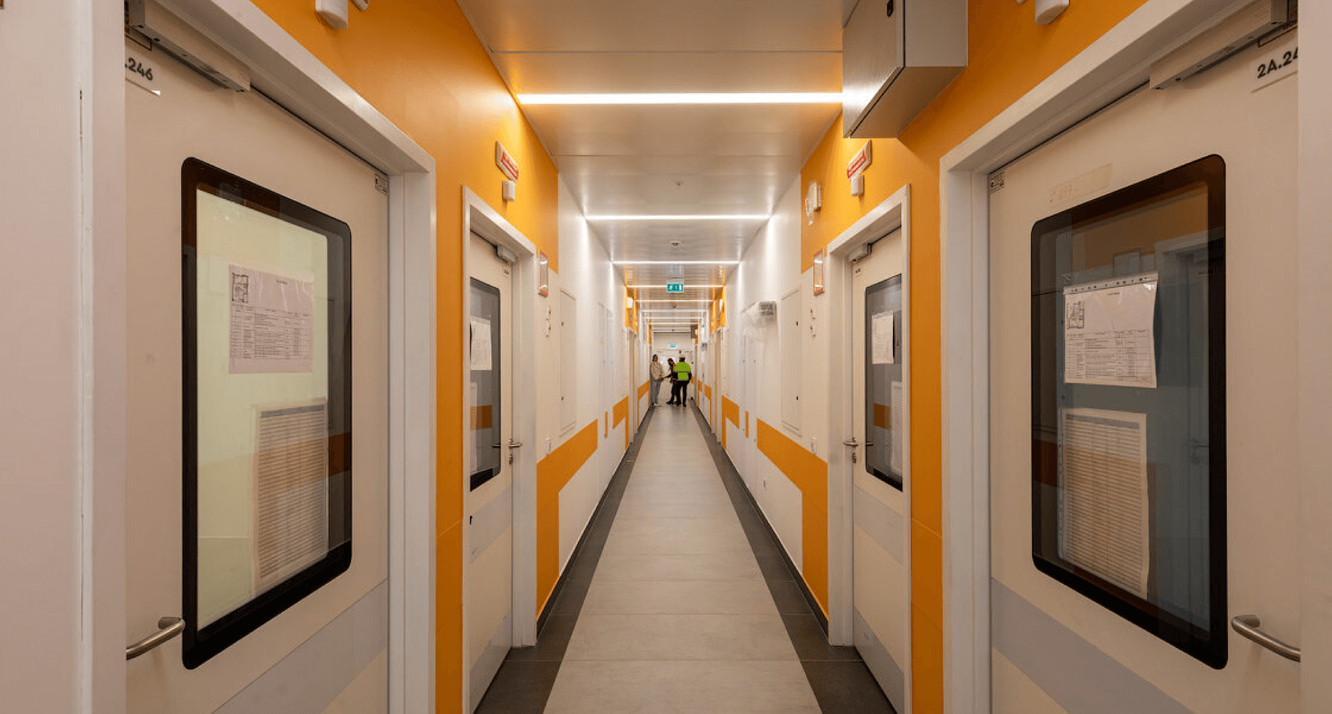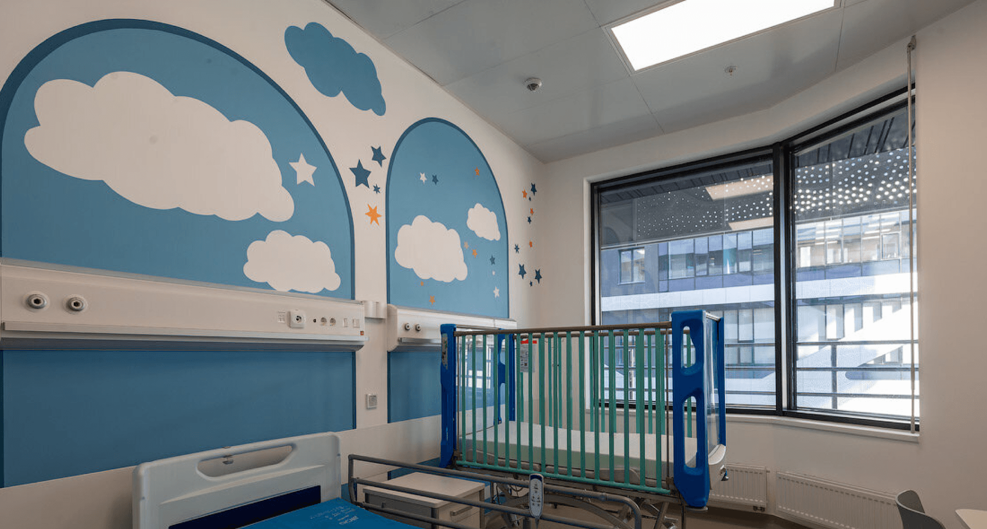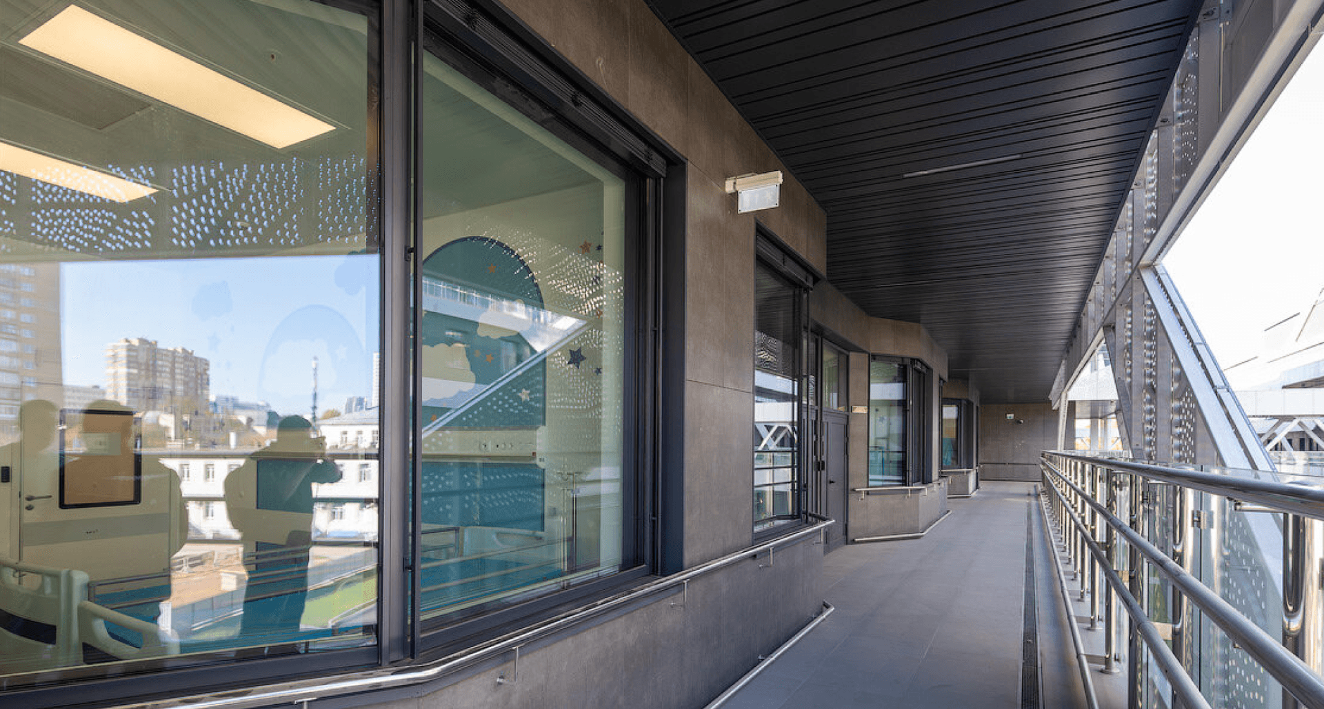 Реализован проект освещения мест общего пользования, уличных галерей, коридоров, кабинетов и палат. Применены светильники, которые создают равномерное и мягкое освещение и обеспечивают визуальный комфорт для персонала и пациентов. Разработано более 50 модификаций.