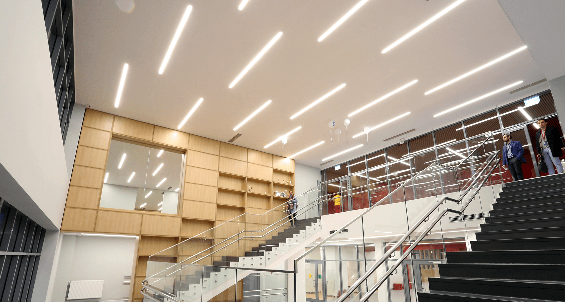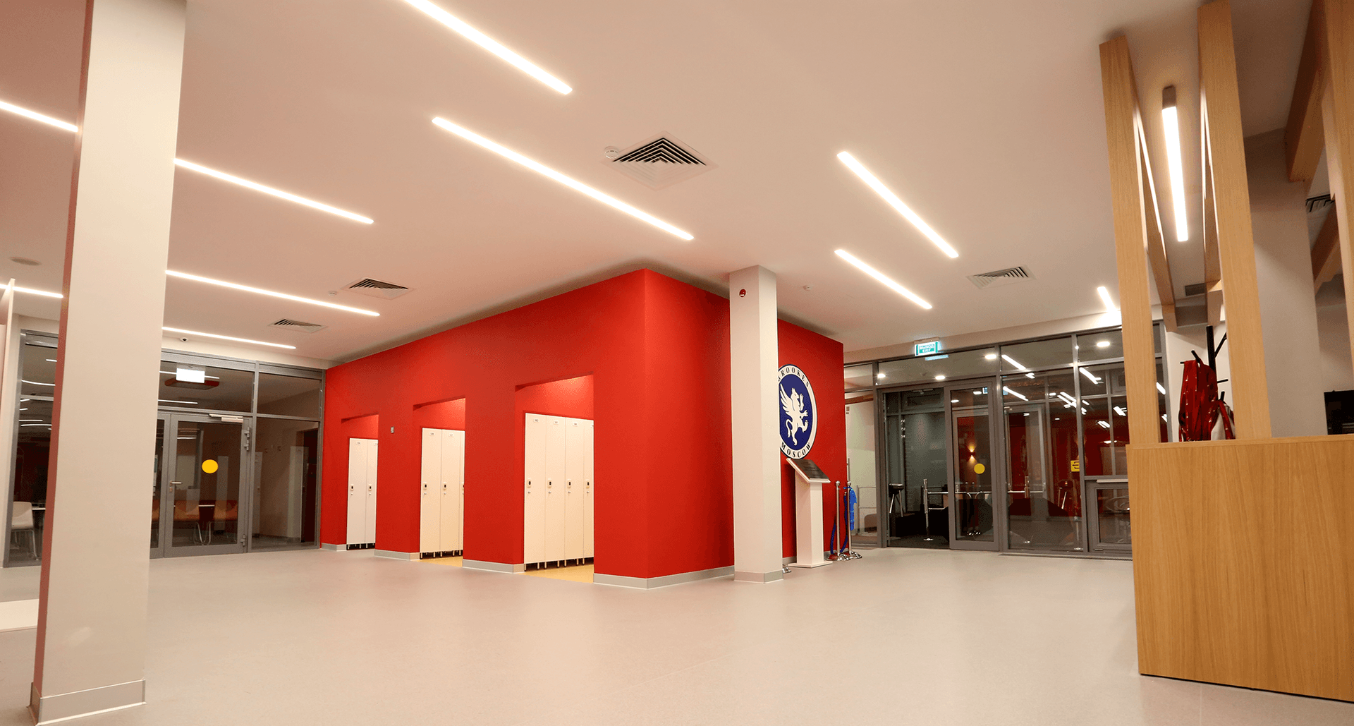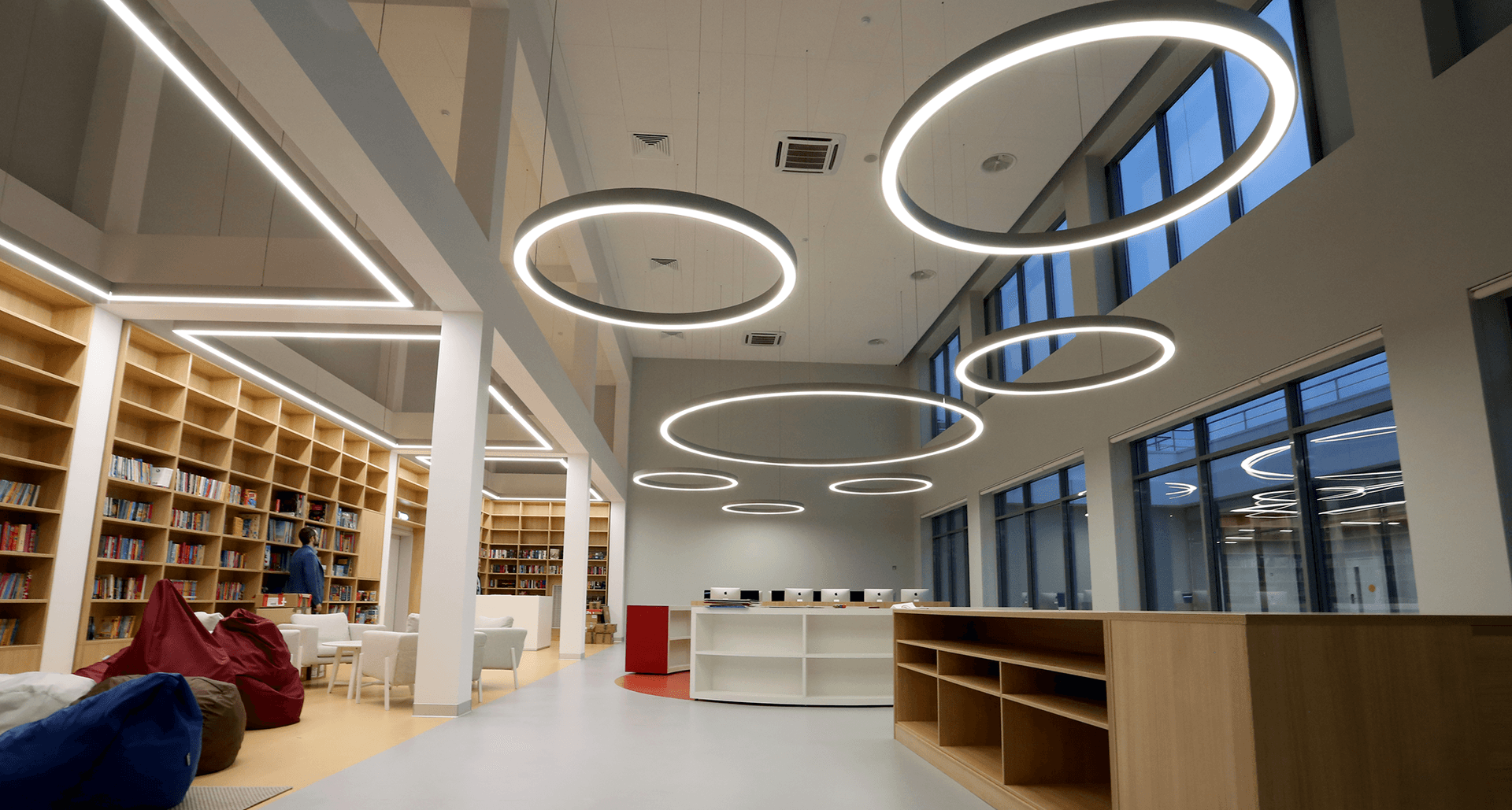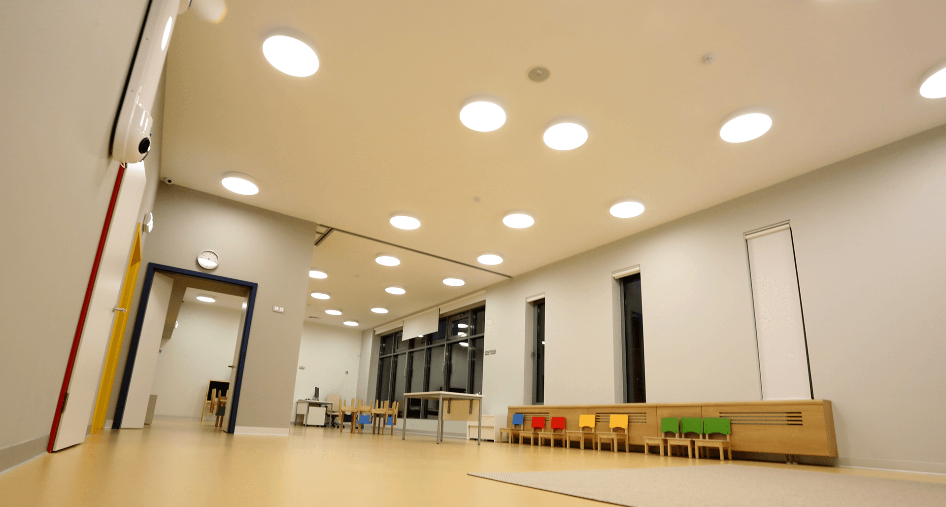 Комплексное современное освещение всех зон школы, учитывающее прежде всего комфорт восприятия световой среды с применением принципов зонирования цветовой температурой.Современное образовательное учреждение – это сложнейшее техническое задание всем эксплуатирующим службам и, в особенности, строителям. Совмещение в одном здании детский сад и школу накладывает дополнительные сложности со стороны действующих строительных норм.