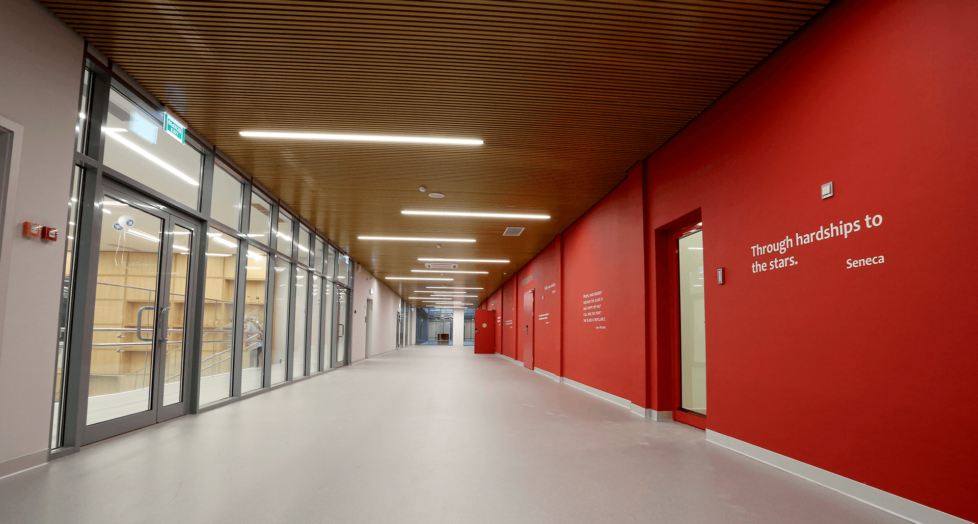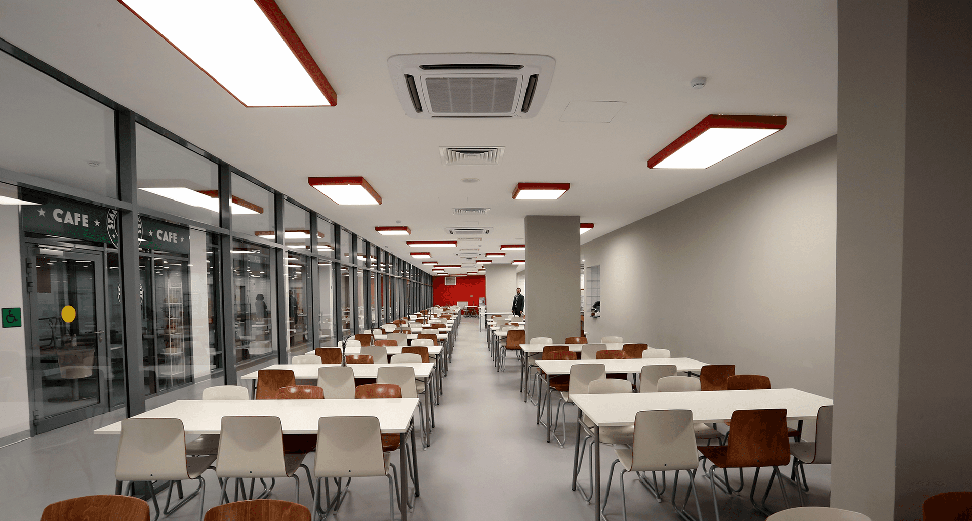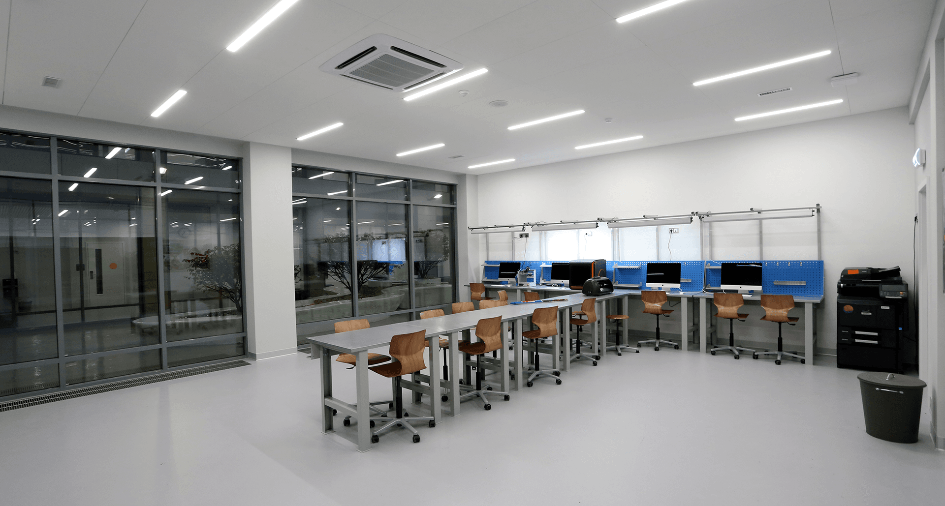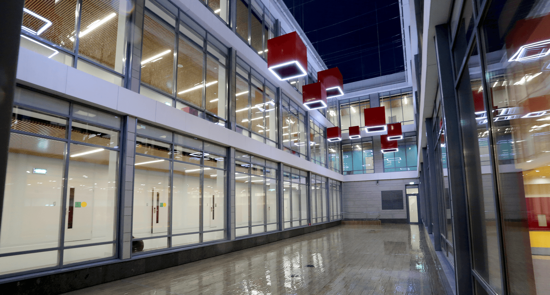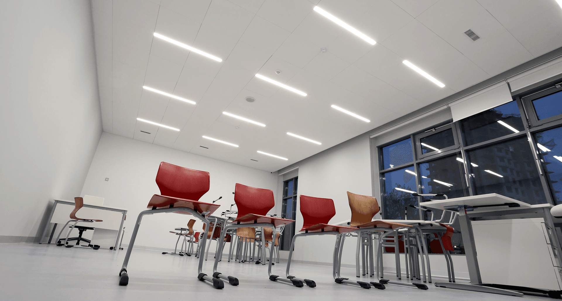 Комплексное современное освещение всех зон школы, учитывающее прежде всего комфорт восприятия световой среды с применением принципов зонирования цветовой температурой.Современное образовательное учреждение – это сложнейшее техническое задание всем эксплуатирующим службам и, в особенности, строителям. Совмещение в одном здании детский сад и школу накладывает дополнительные сложности со стороны действующих строительных норм.