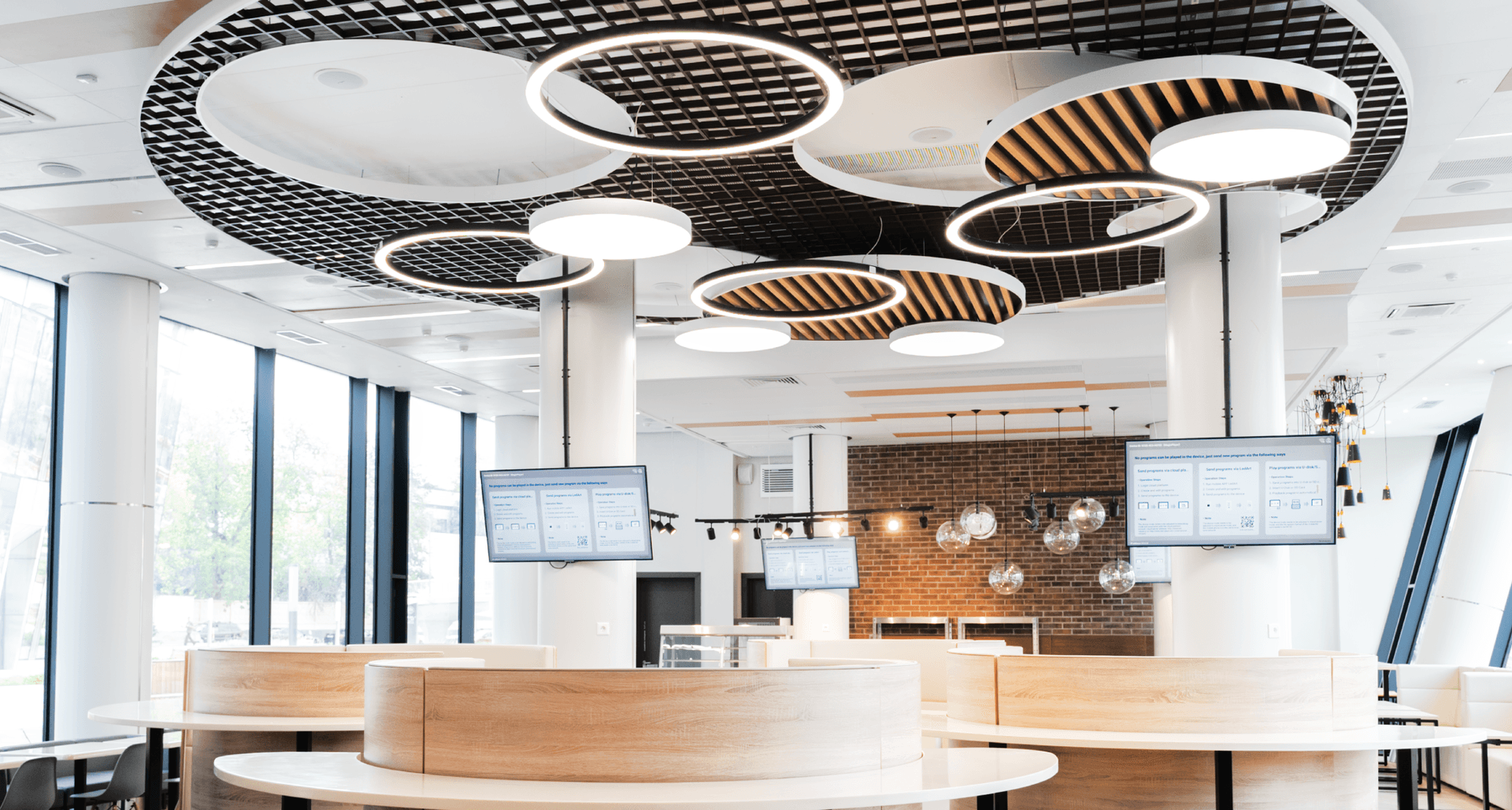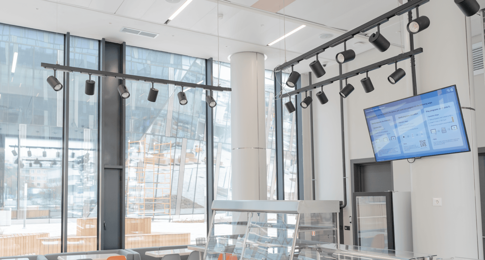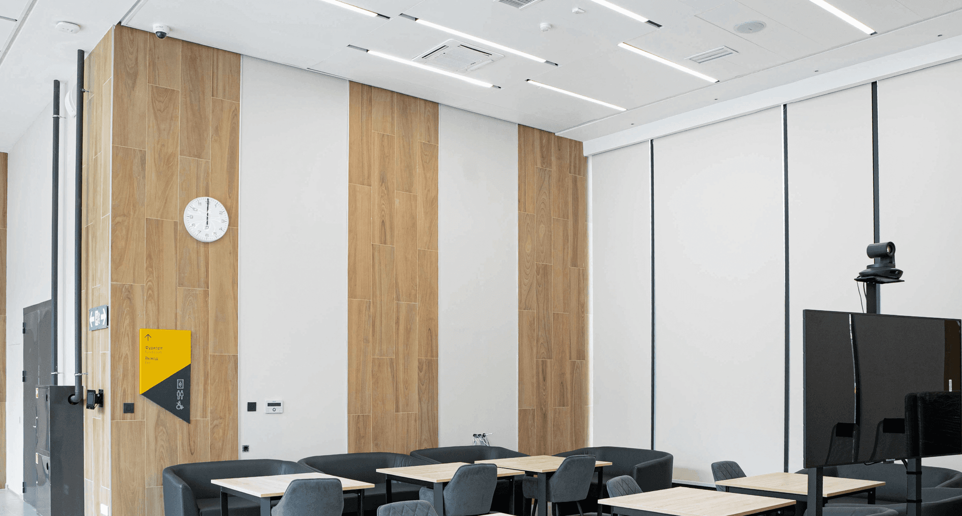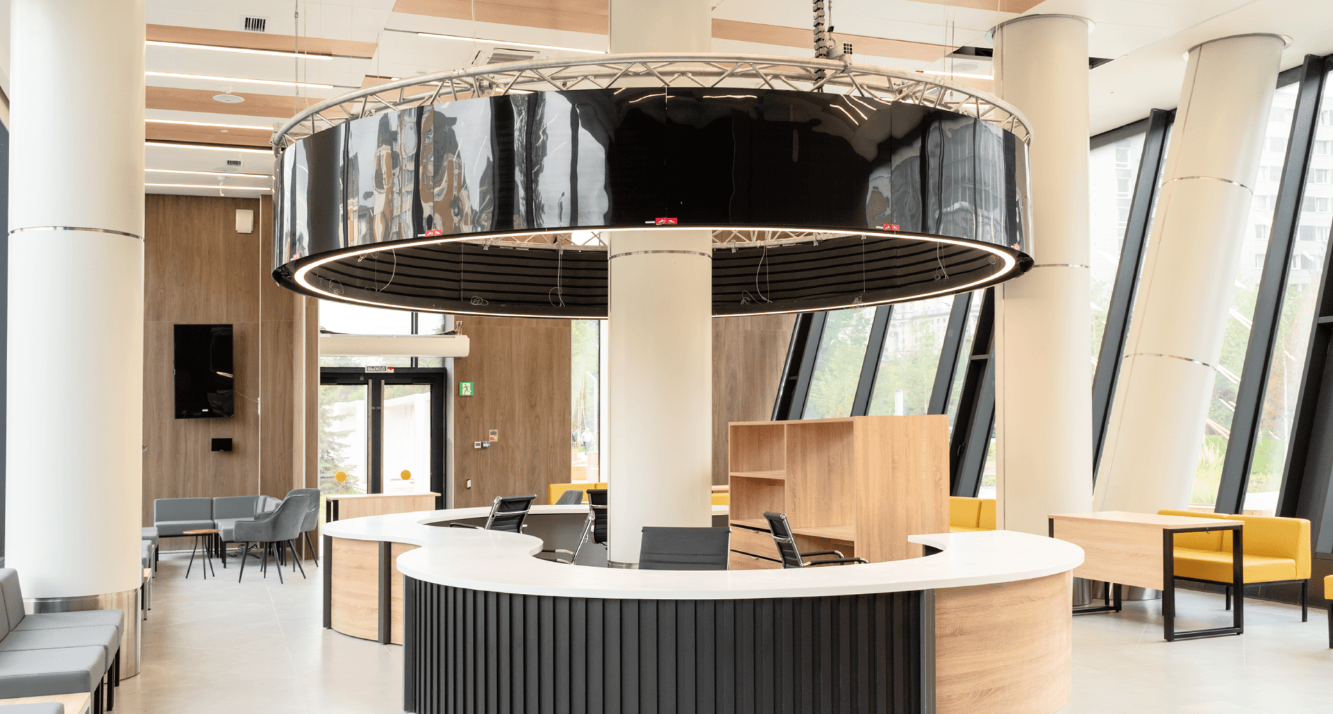 Основу светового решения составляют линейные светильники PROFILE 60L P LED и T120 LED. Наиболее эффектные решения, создающие уютную атмосферу в общественных зонах, – это круги CYCLE P LED, OREOL FLD/P и SOL S LED, а также даунлайты SAFARI DL LED и COLIBRI DL LED.
