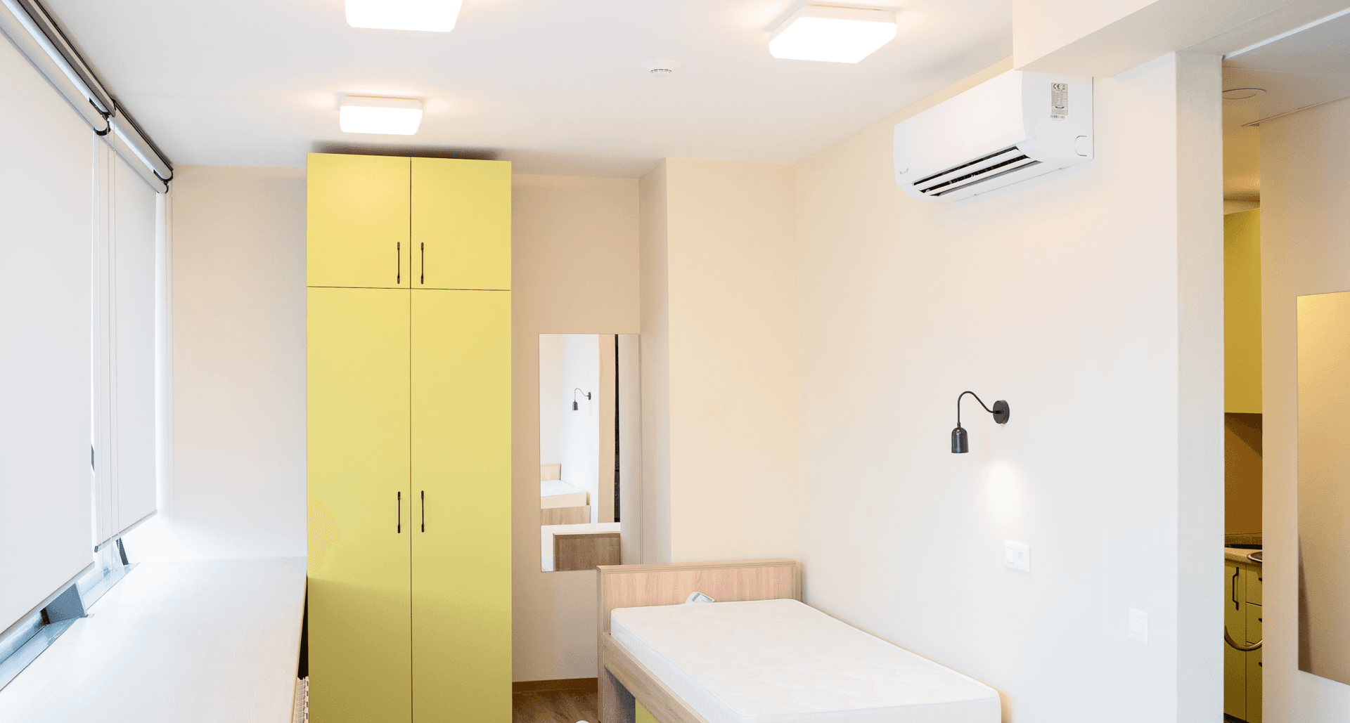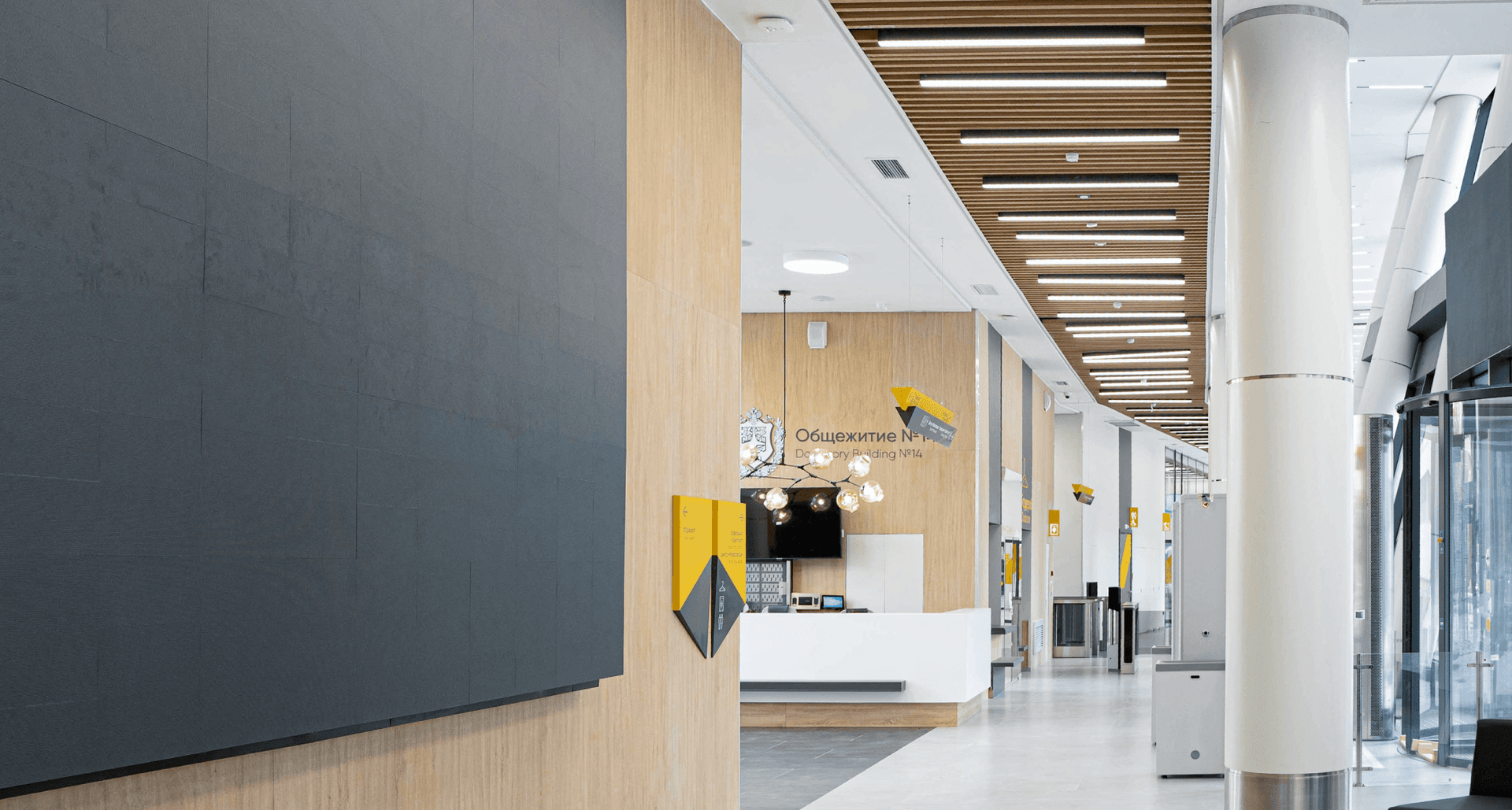 Нами был реализован весь спектр освещения: от аварийного и основного (включая комнаты общежития) до технического и дизайнерского, а также системы управления.