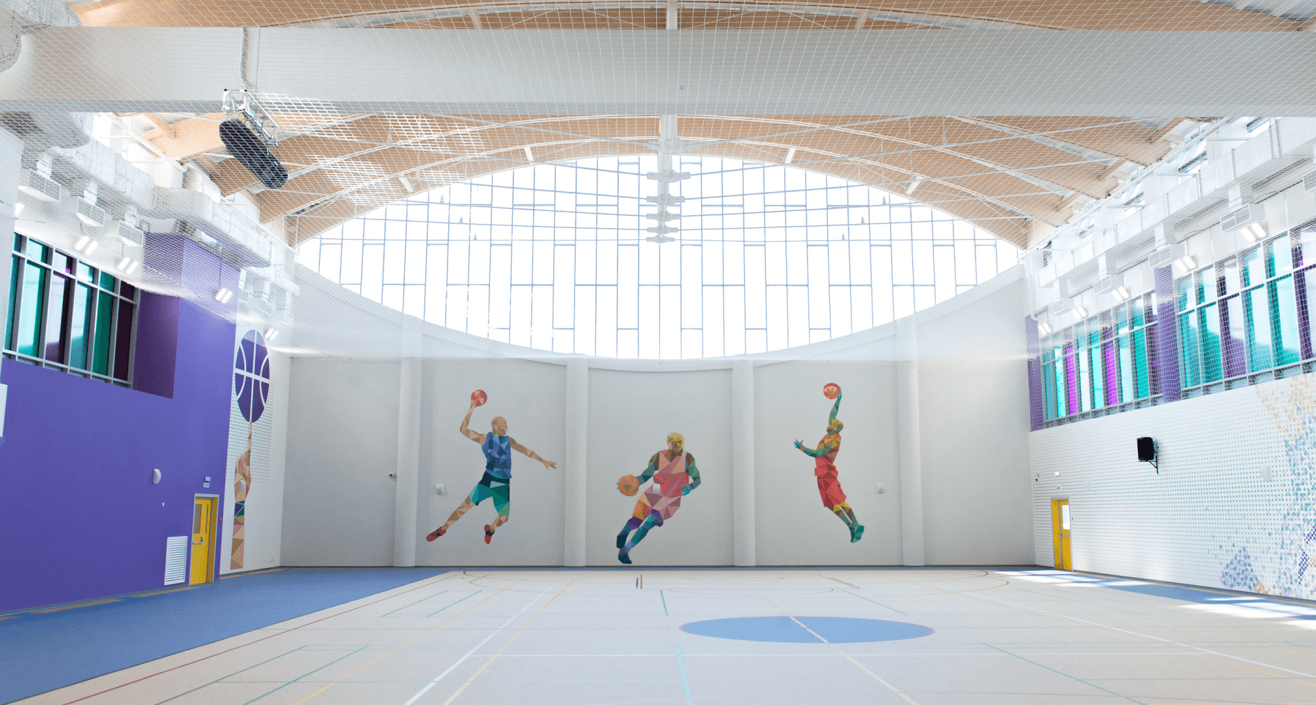Применение большепролетных конструкций из клееной древесины обеспечивает поступление естественного света в здание гимназии. Естественный свет, максимизированный использованием второго света, витражей, окон от пола до потолка в коридорах, открытых на всю высоту здания, - одна из ключевых особенностей этого проекта. Необходимо было учесть этот фактор при создании искусственного освещения.