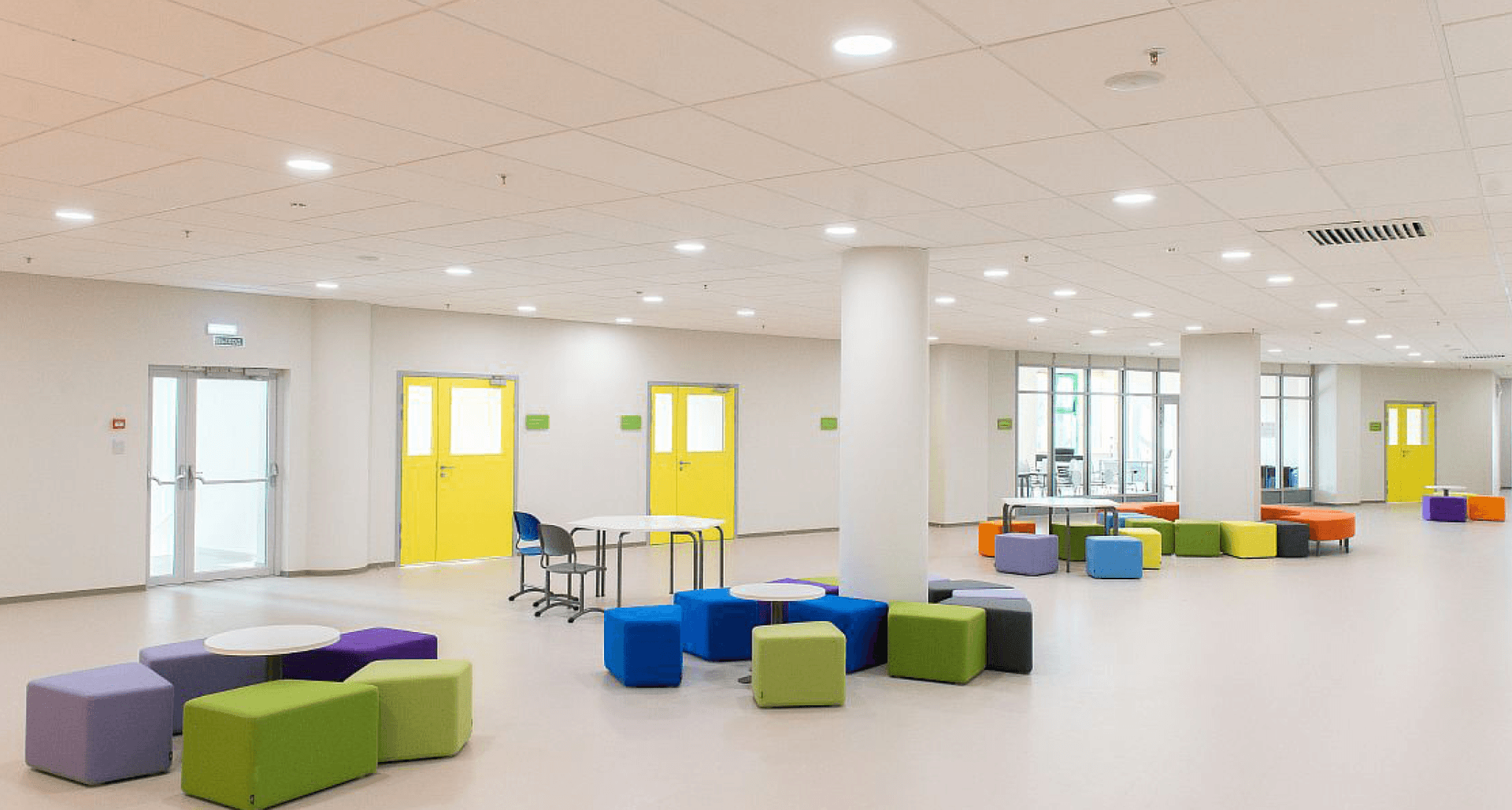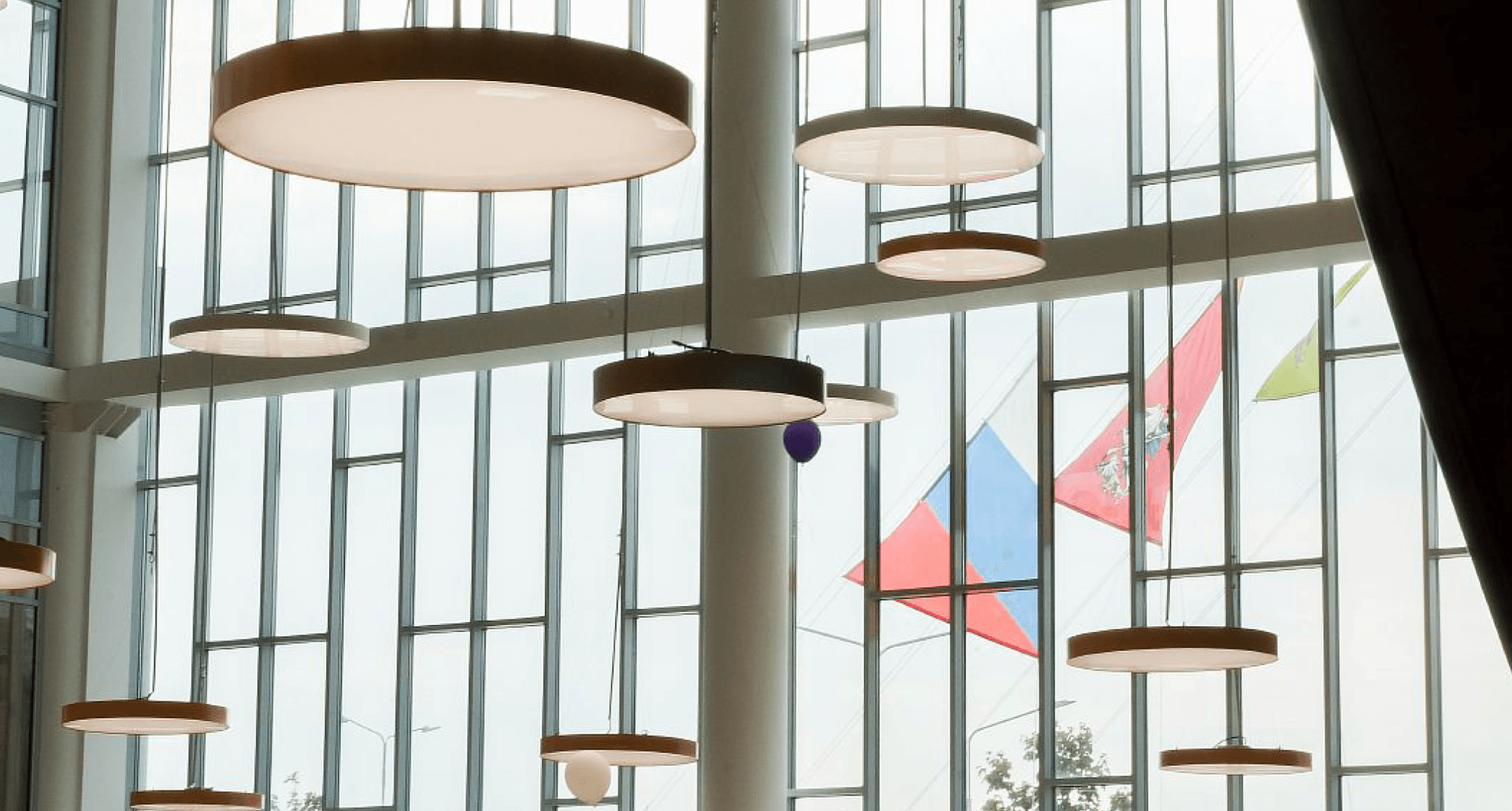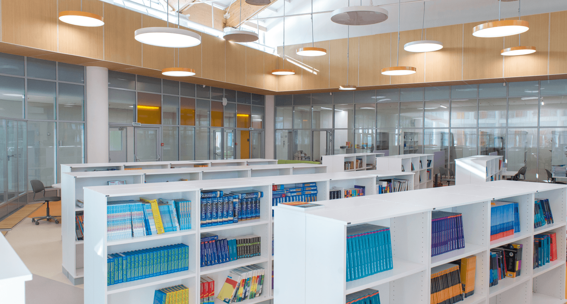 Согласно дизайн-проекту были разработаны и произведены светильники, вписавшиеся в интерьер современной школы и обеспечивающие комфортное освещение для учащихся и учителей в темное время суток.