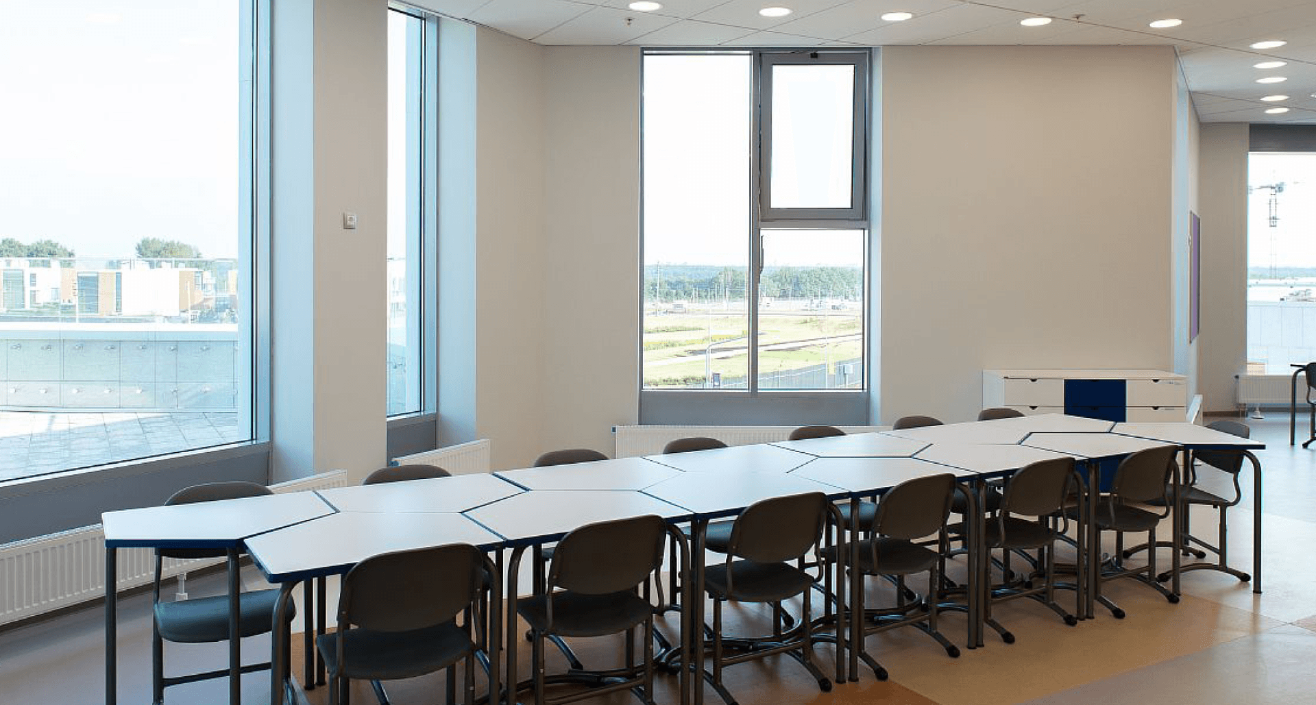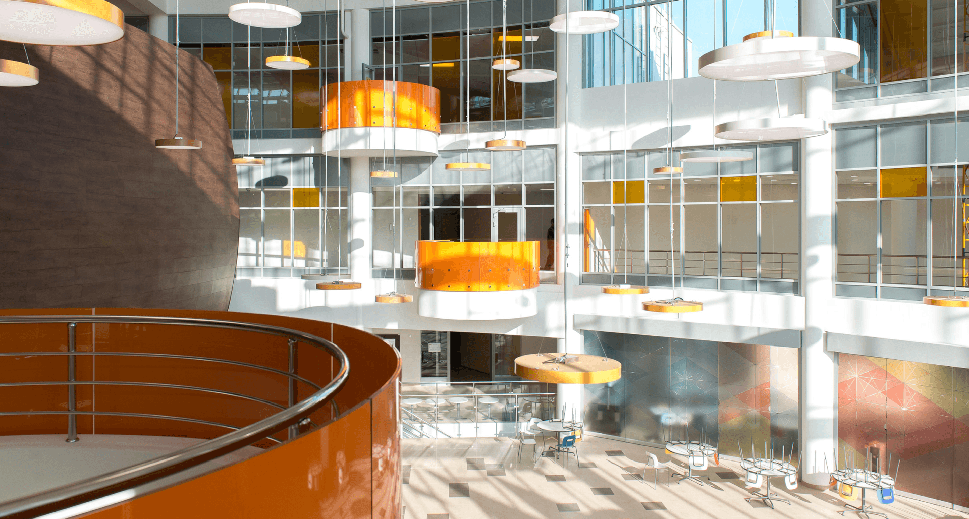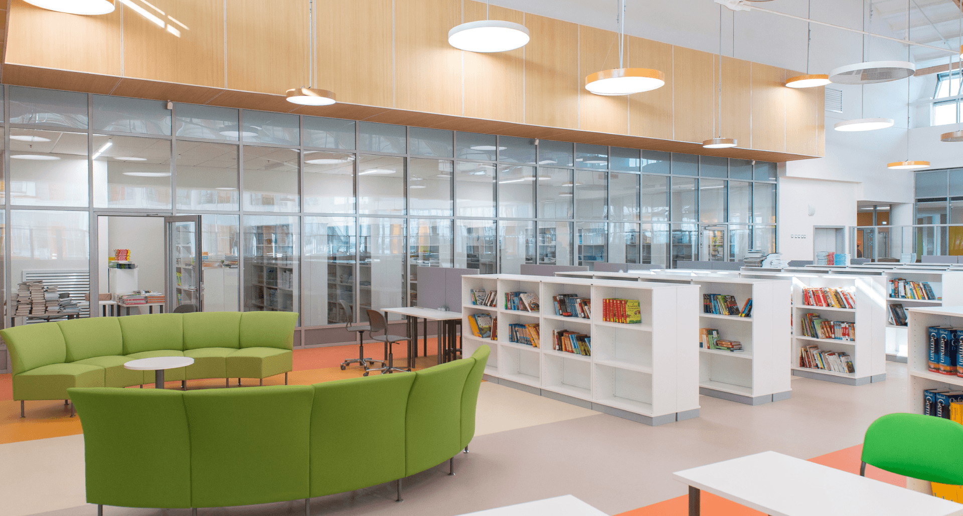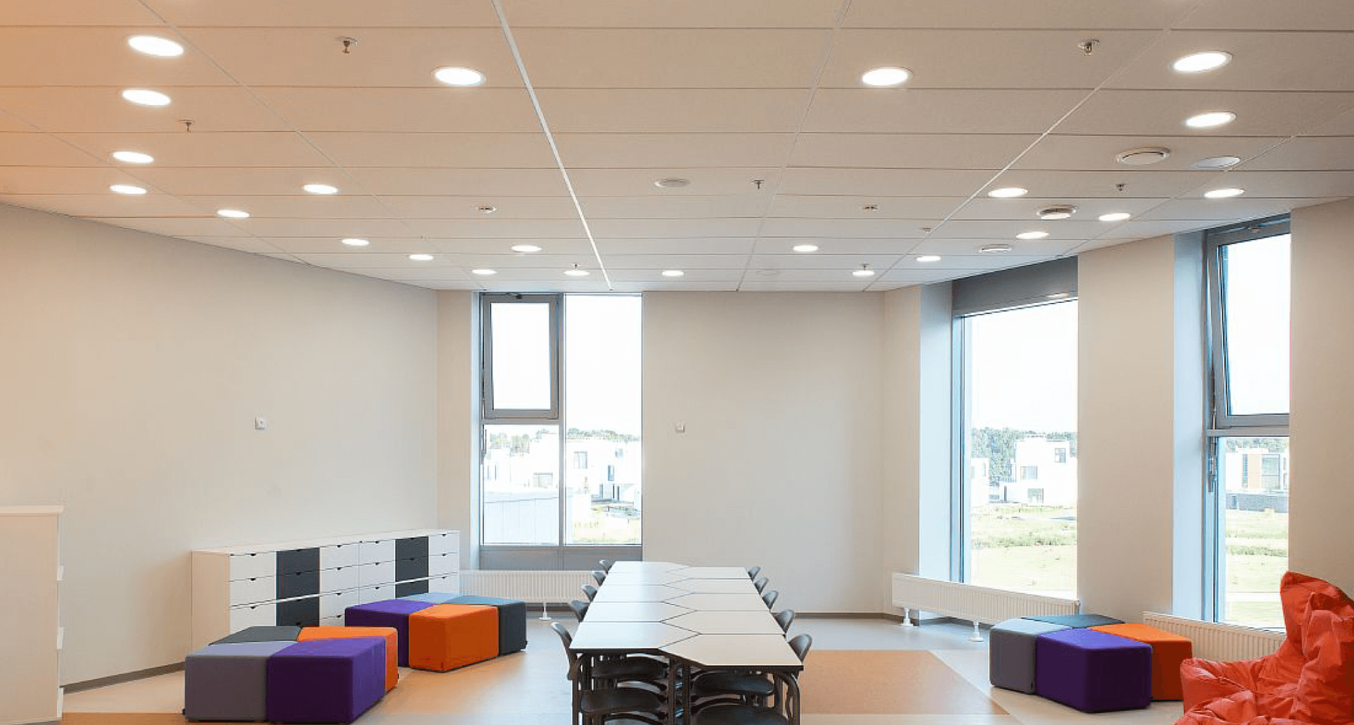 Согласно дизайн-проекту были разработаны и произведены светильники, вписавшиеся в интерьер современной школы и обеспечивающие комфортное освещение для учащихся и учителей в темное время суток.