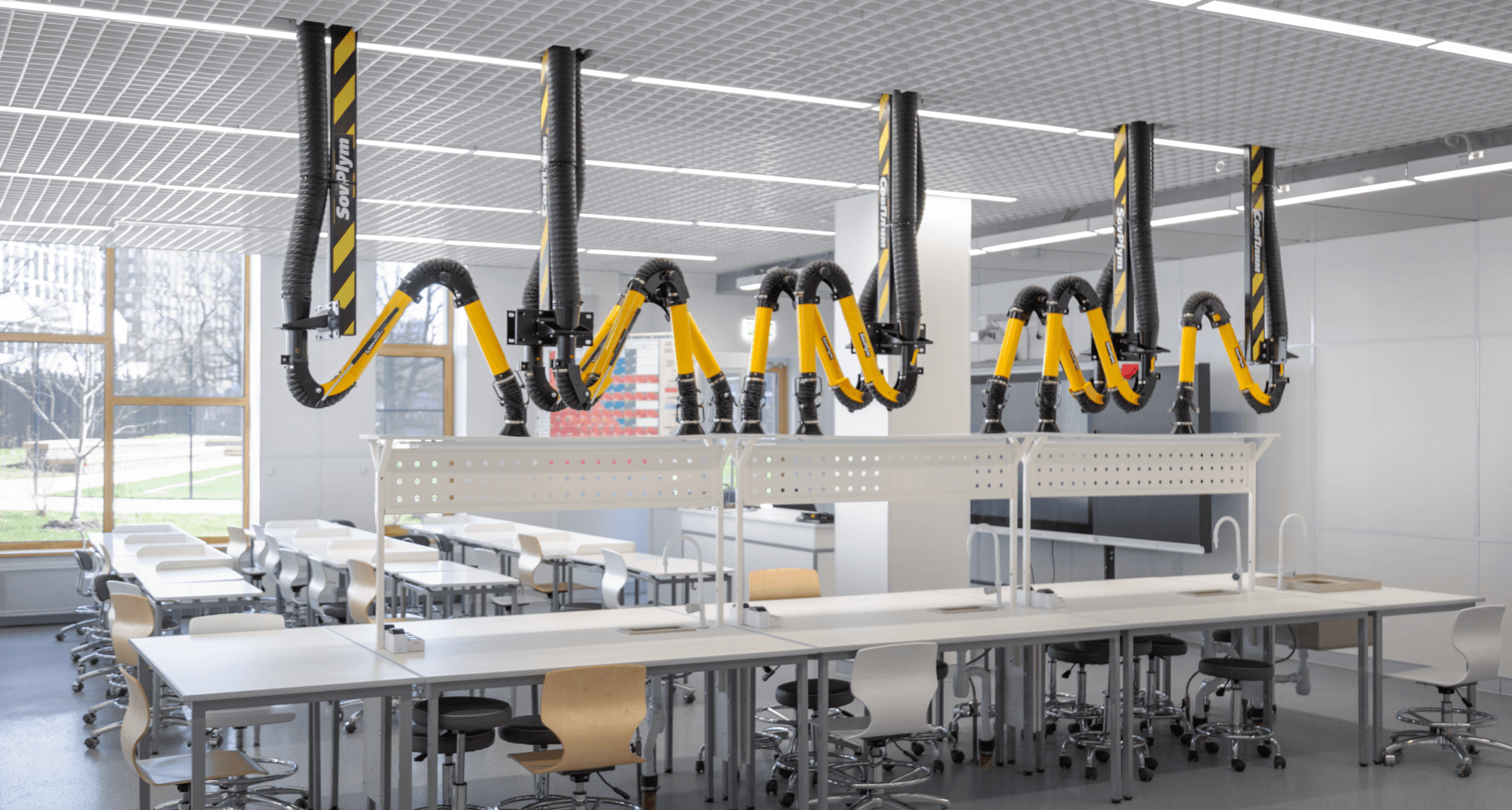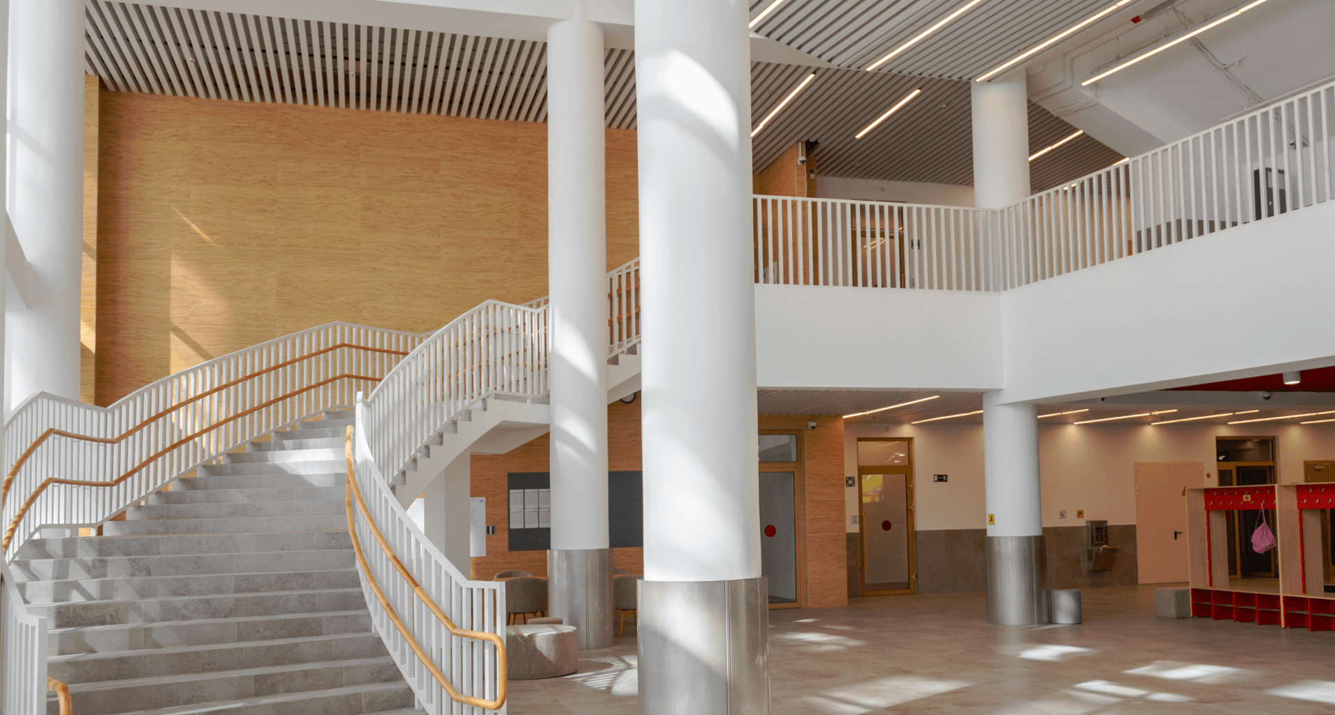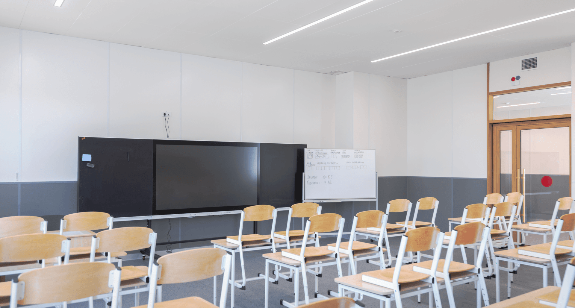 Были предложены световые решения, которые учли сложность архитектуры - двухсветные и трехсветные пространства, световые зенитные фонари (особые архитектурные конструкции, которые предназначены для естественного освещения помещения солнечными лучами), современные технологии (интерактивные доски), работу с книгами и тетрадями, возможность плавного светорегулирования, рядности включения, исключения паразитной засветки в компьютеры учеников и экраны интерактивных досок.