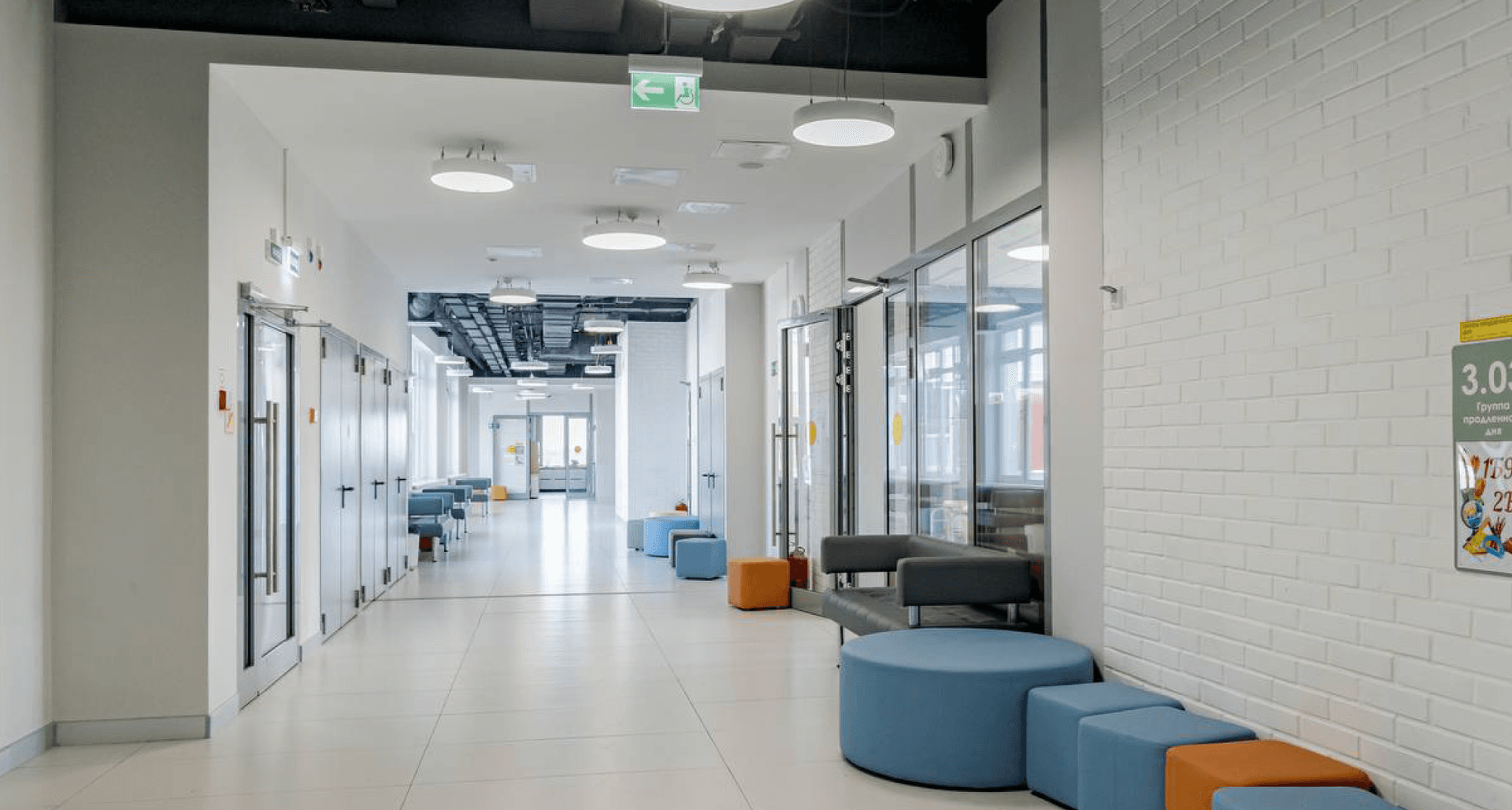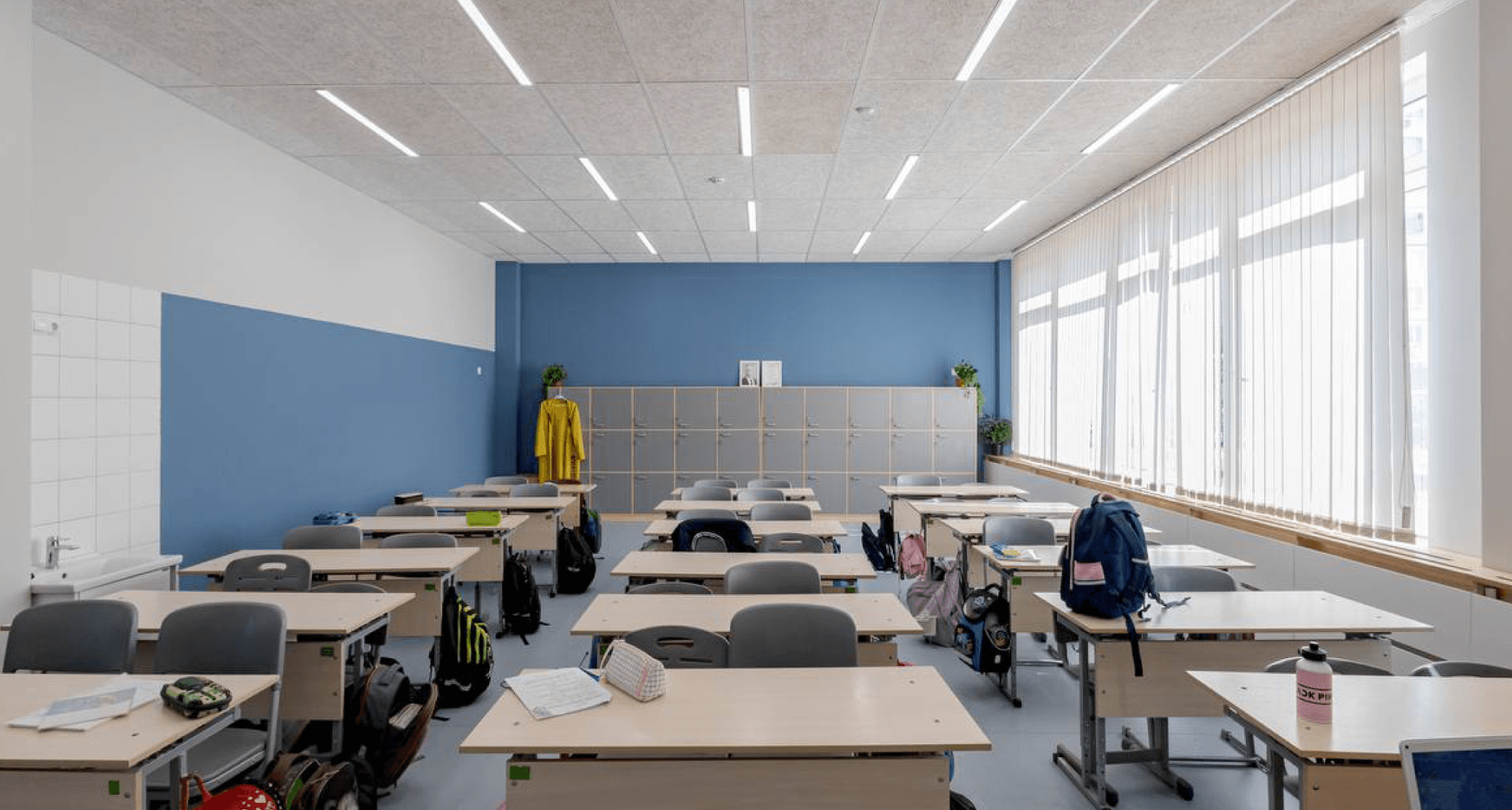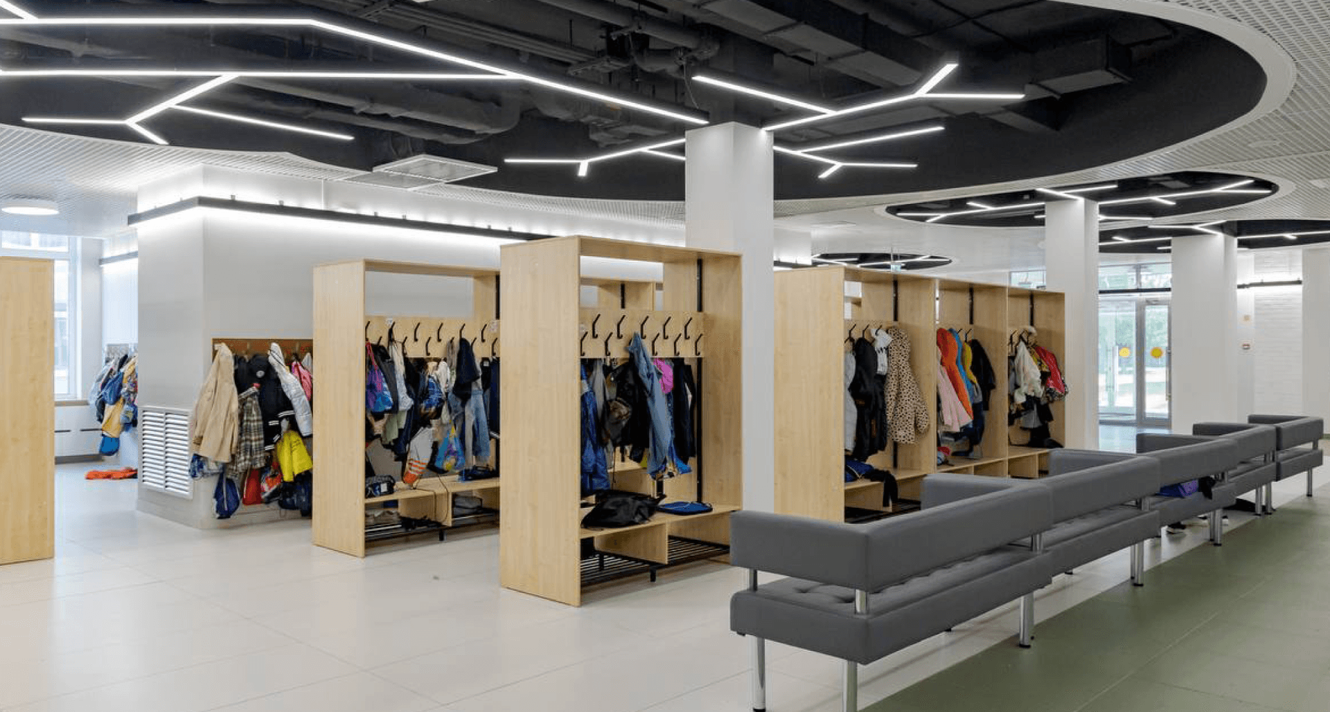 были применены светильники, удачно дополнившие минималистичный дизайн школы и хорошо зарекомендовавшие себя во многих других образовательных учреждениях. В зоне раздевалки реализовано дизайн-решение на базе стандартных светильников PROFILE, расположенных в виде имитации кроны дерева.