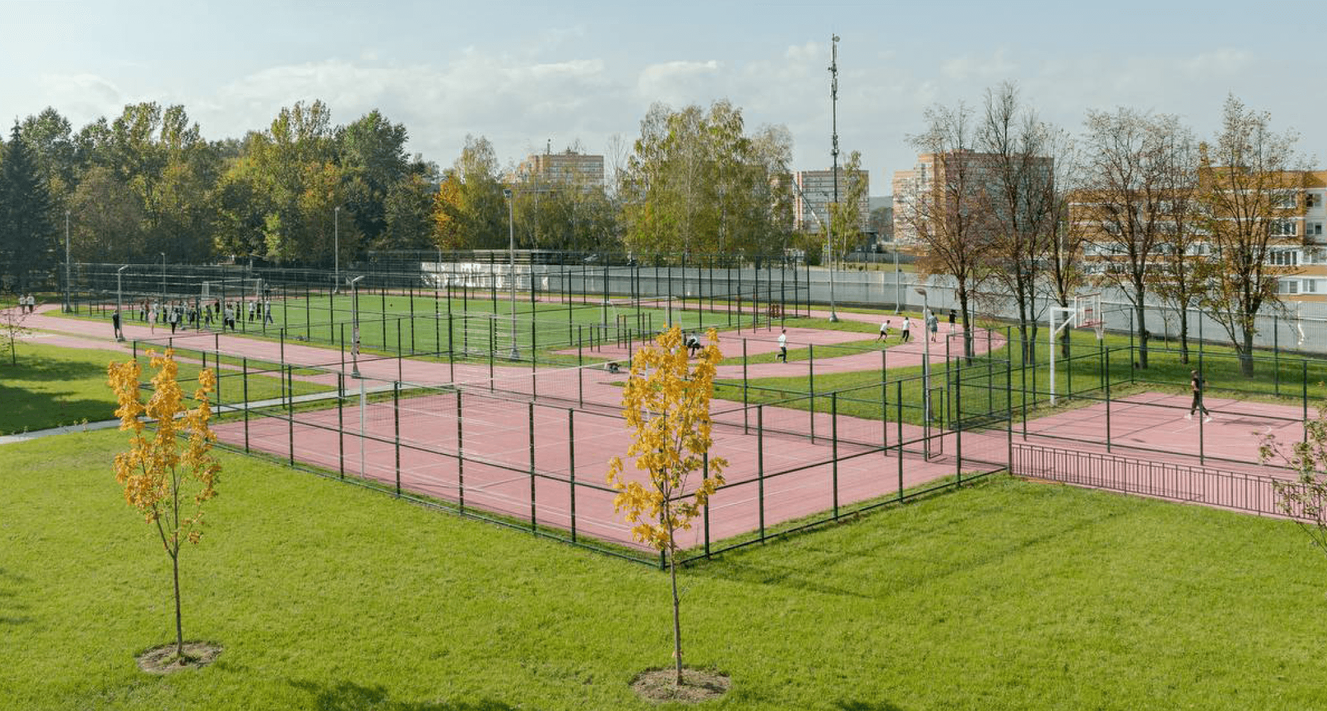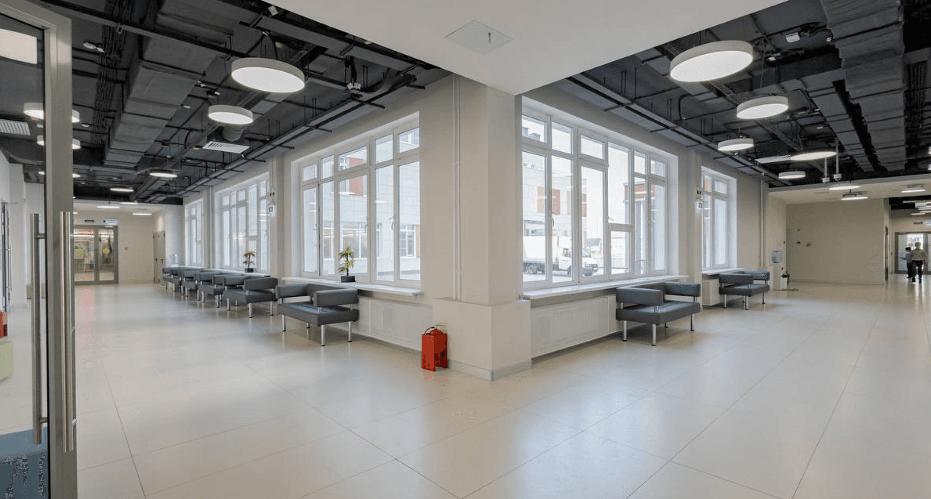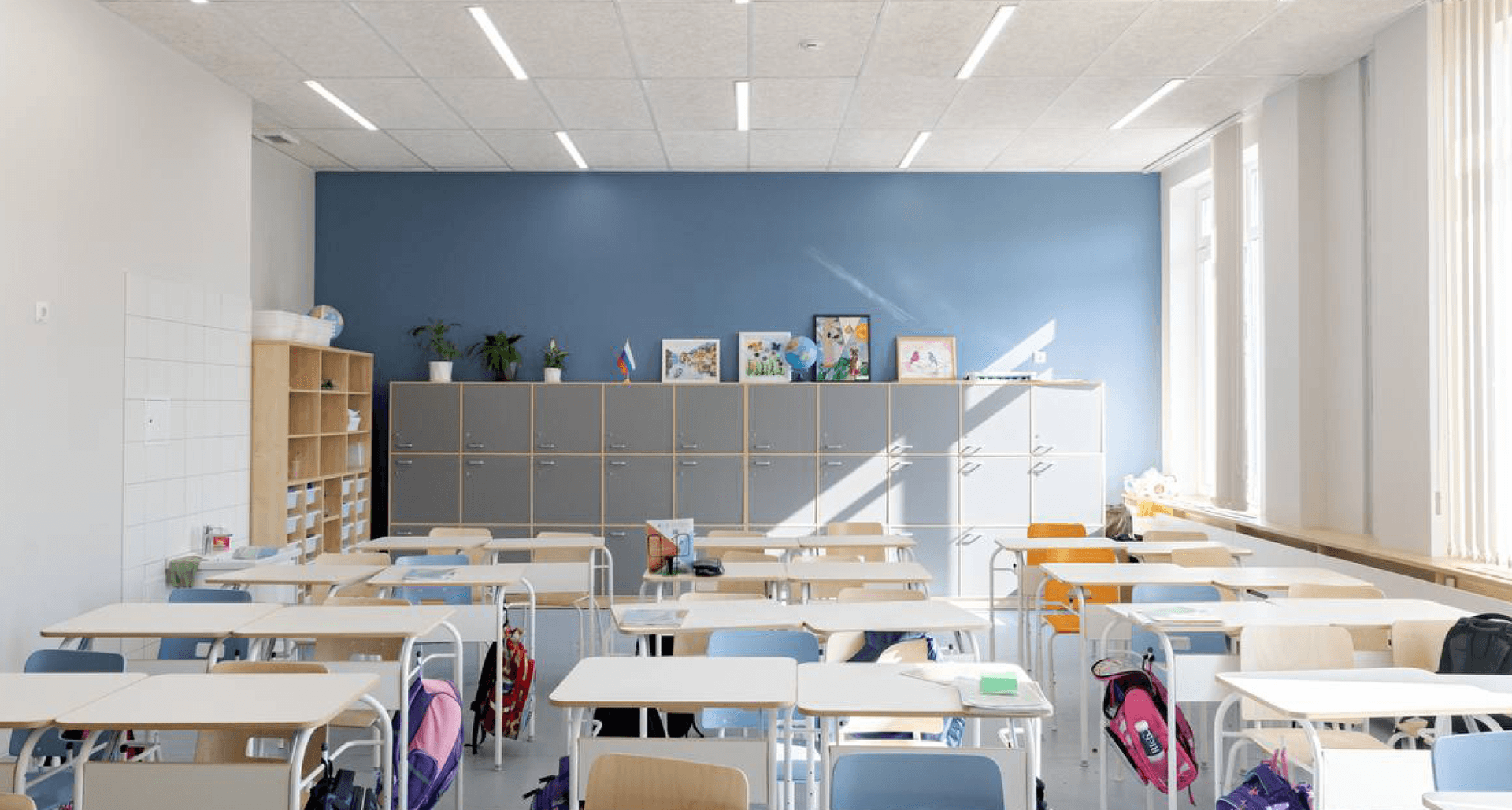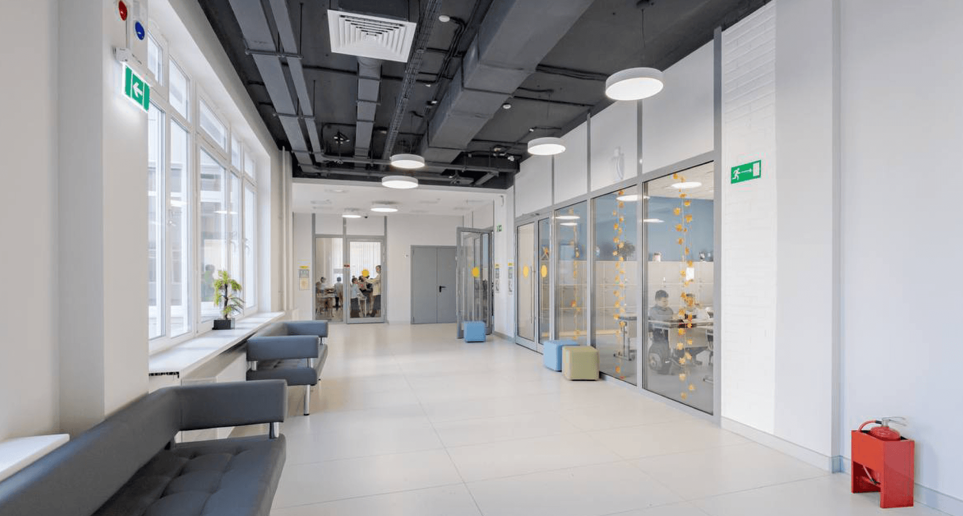 были применены светильники, удачно дополнившие минималистичный дизайн школы и хорошо зарекомендовавшие себя во многих других образовательных учреждениях. В зоне раздевалки реализовано дизайн-решение на базе стандартных светильников PROFILE, расположенных в виде имитации кроны дерева.