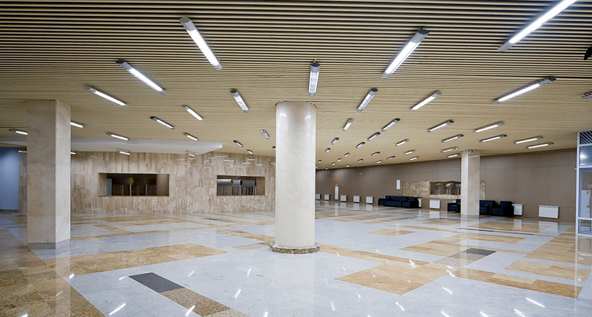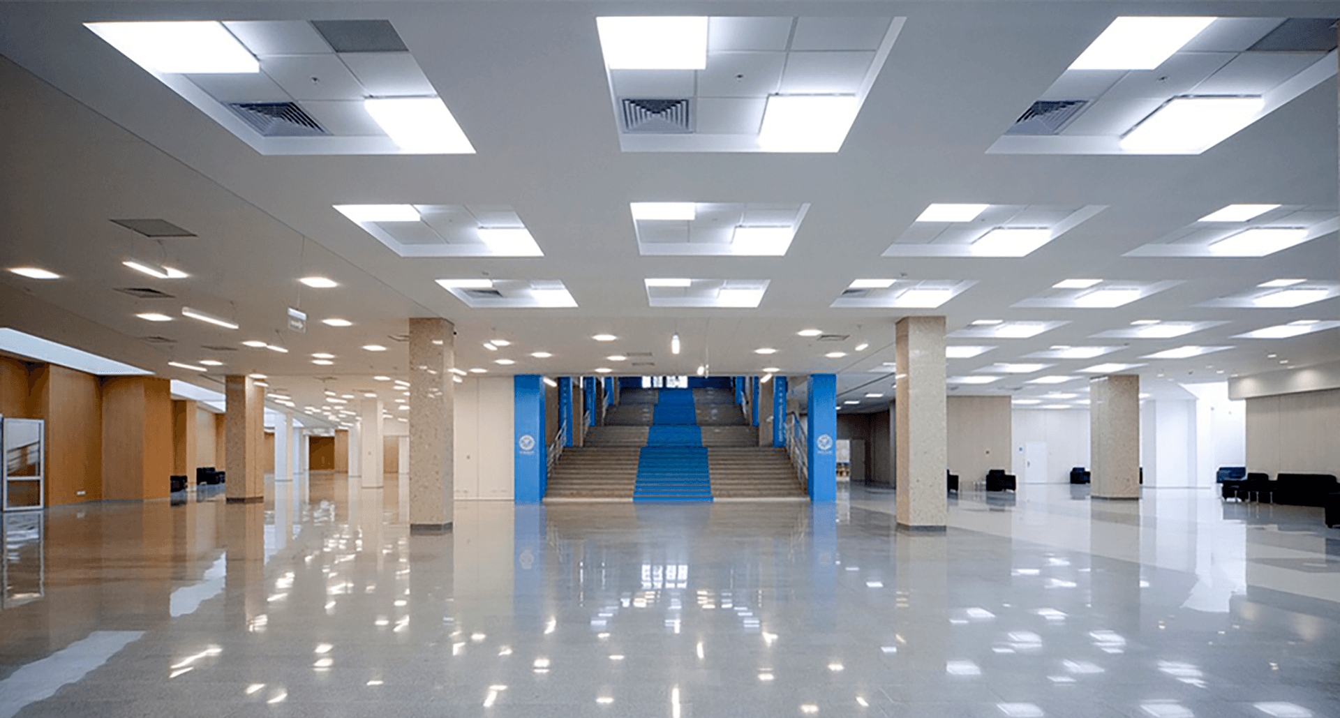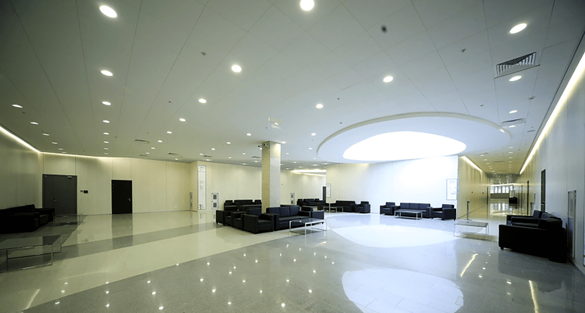 Больше 70% помещений освещено светильниками торговой марки «Световые Технологии», в частности, конференц-зал, зал прессы, а также фудкорт, вспомогательные и офисные помещения.