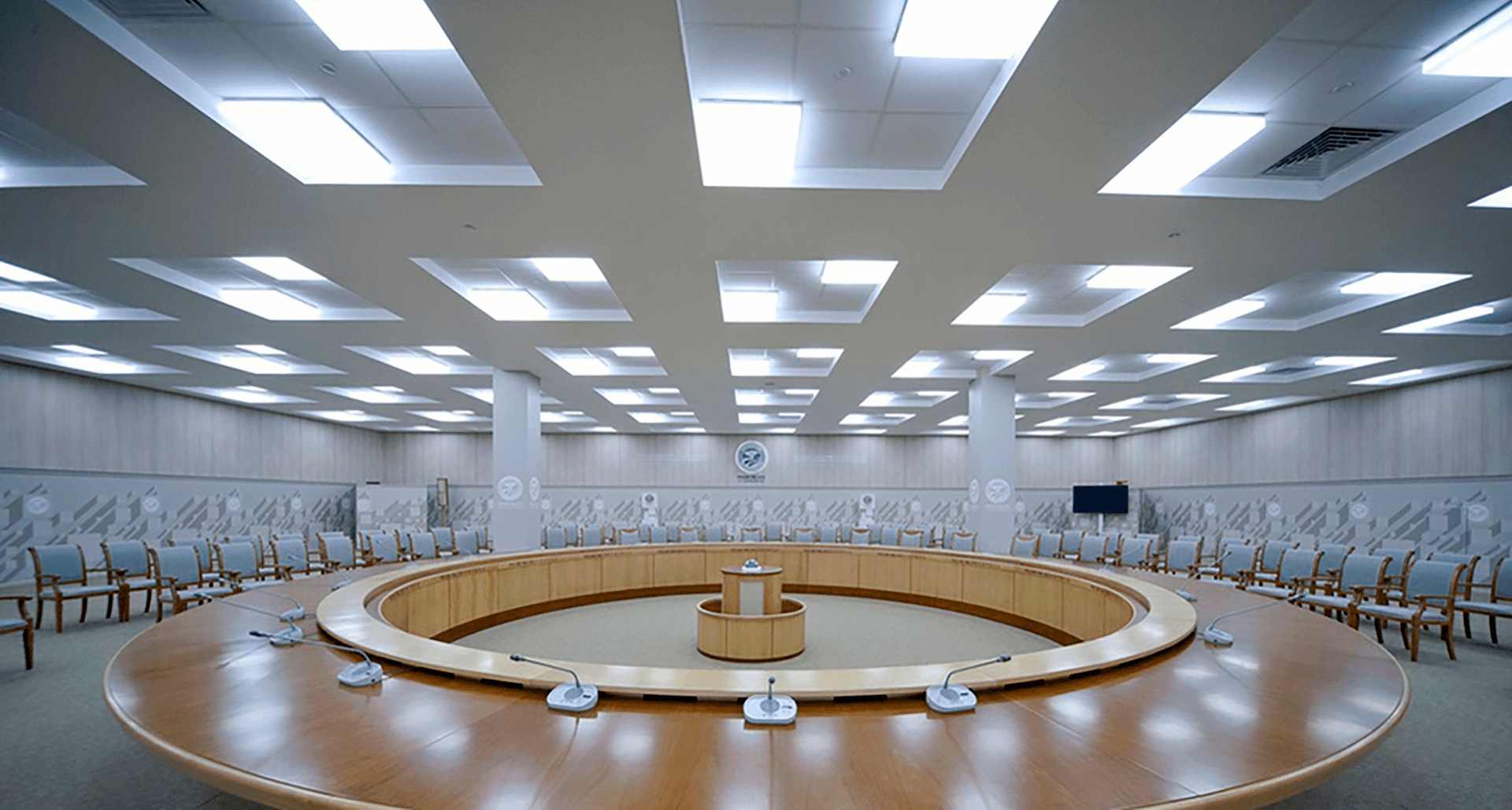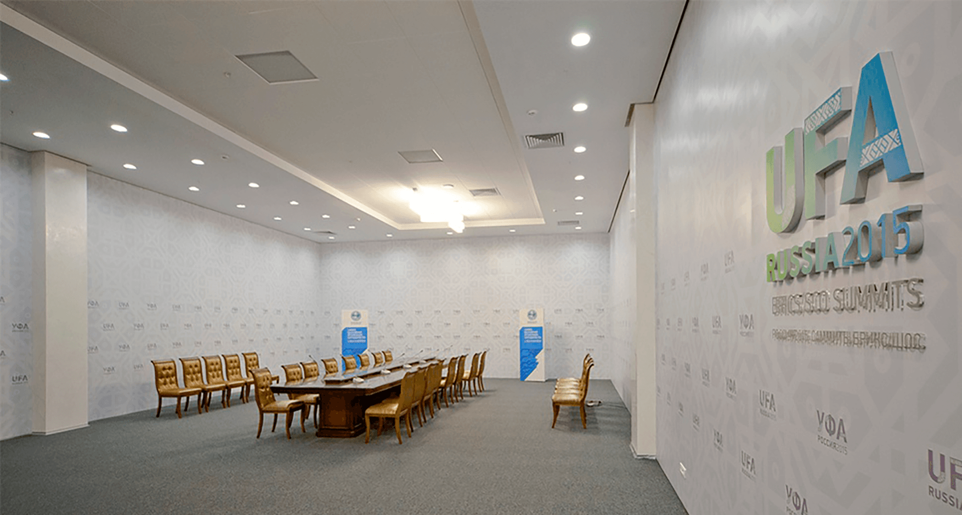 В связи с комплексной реконструкцией здания в преддверие саммитов стояла задача спроектировать и заменить освещение в соответствии с дизайн-концепцией. Работа велась совместно с архитектурной студией и при непосредственном участии офиса главного архитектора Республики Башкортостан. Дизайн потолка в конференц-зале и ряде других помещений представляет орнамент с шестигранниками, куда было необходимо вписать светильники. Поэтому основным здесь было подобрать светильники, которые по размерам соответствовали бы боковой грани фигуры.
