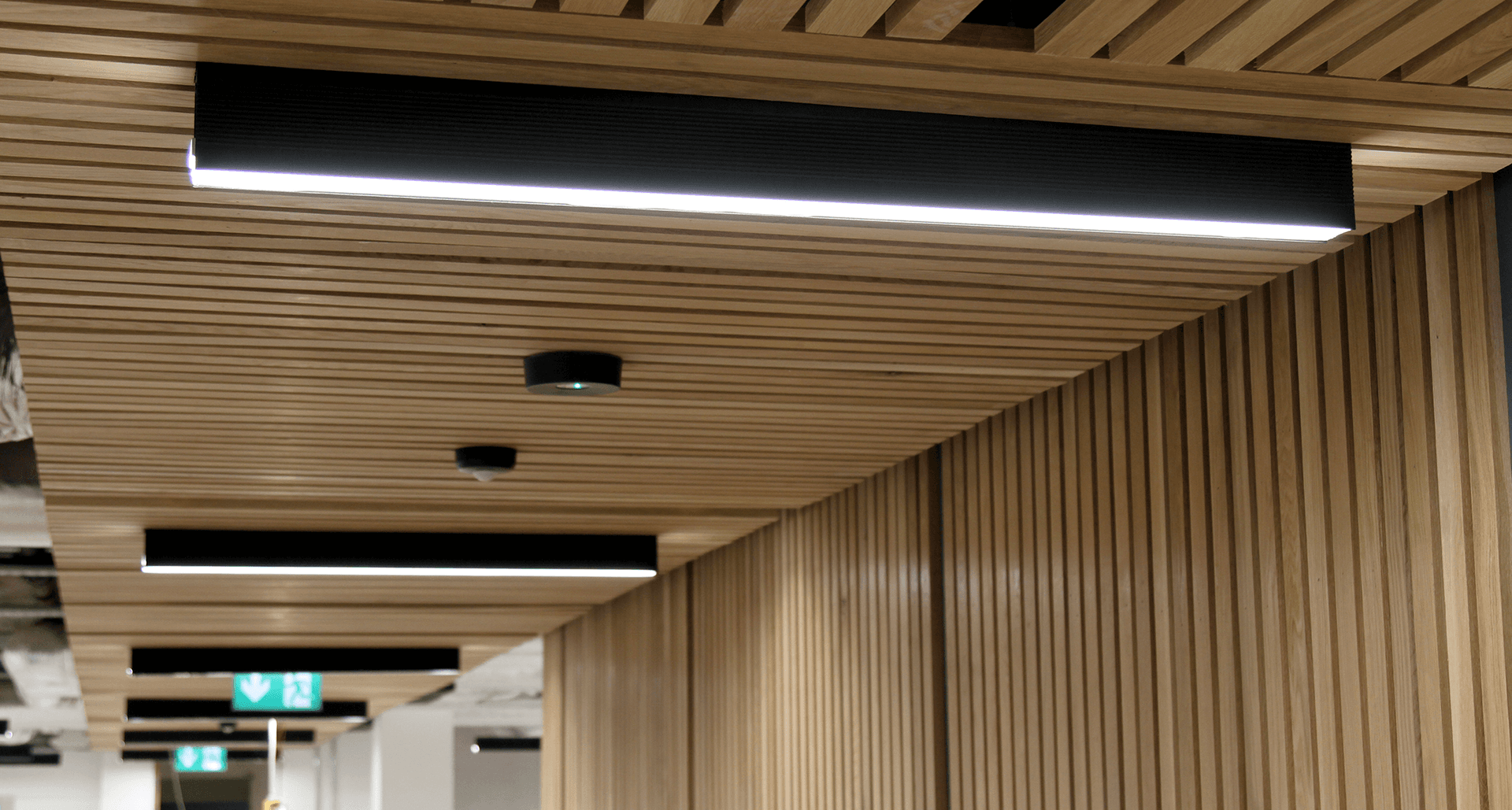Подобраны линейные светильники темного цвета, интегрированные с узким линейным потолком.