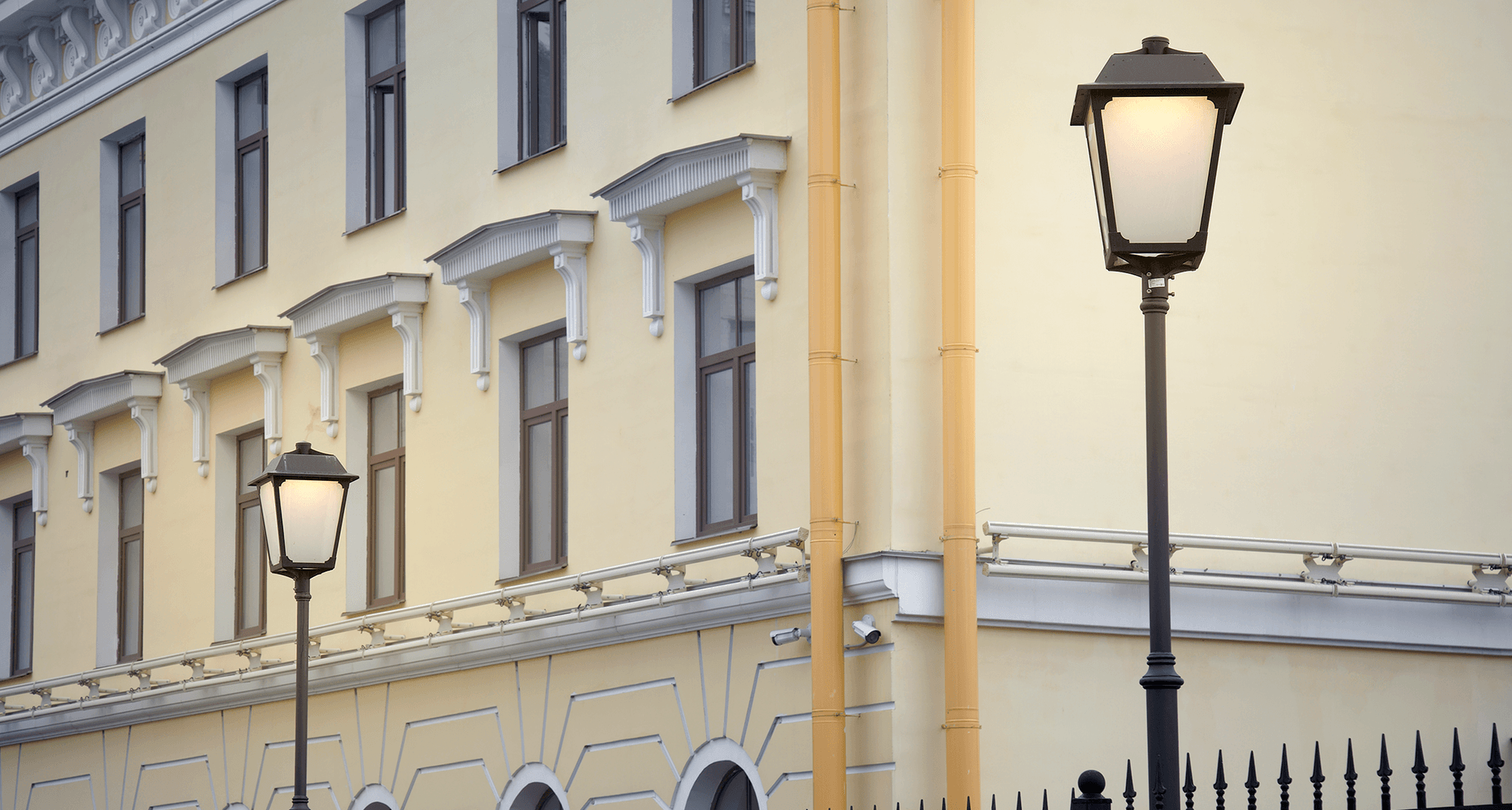 Для наружного освещения применены светильники CLASSIC LED. Эти приборы выполнены в ретро дизайне с современными источниками света для освещения исторических районов, парков и скверов. Выполняются в торшерном и подвесном исполнении, просты в монтаже и дают комфортную, равномерную засветку.