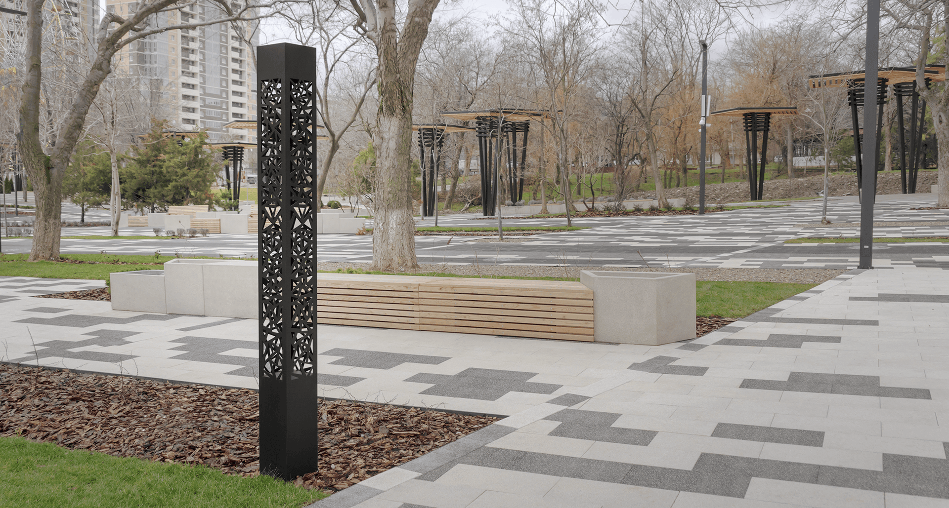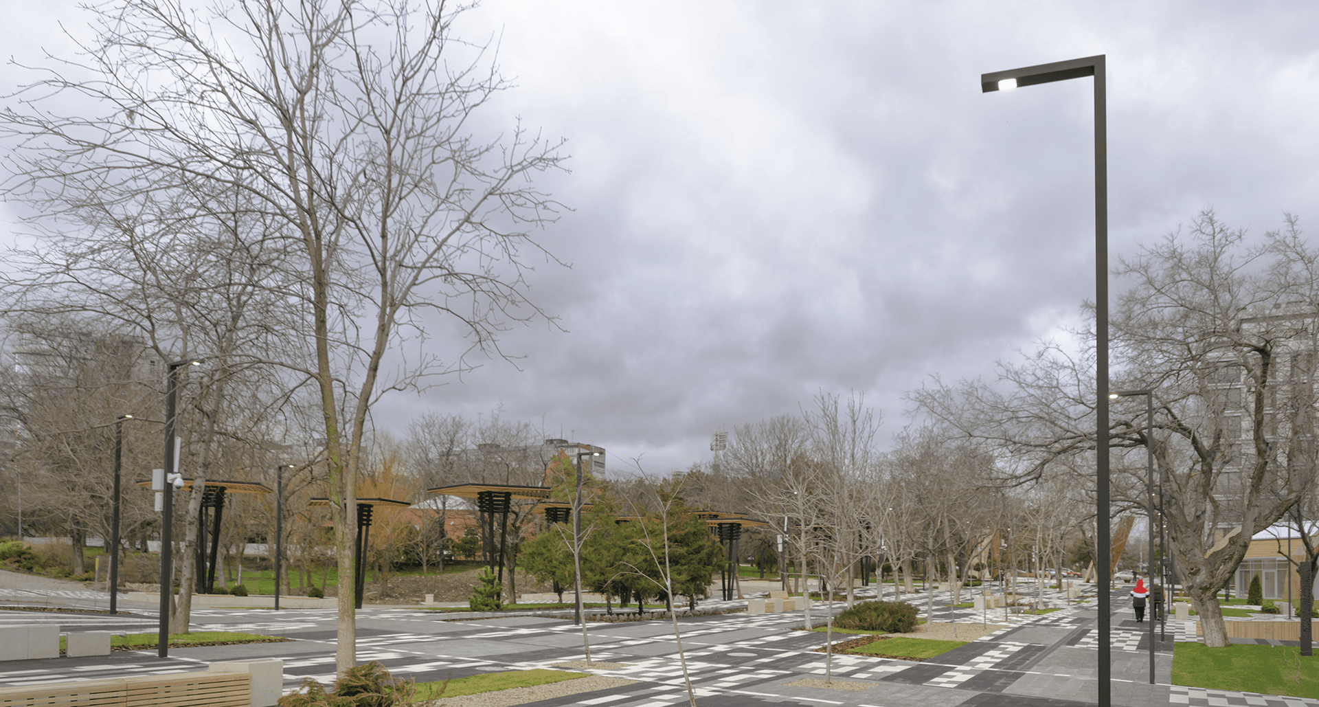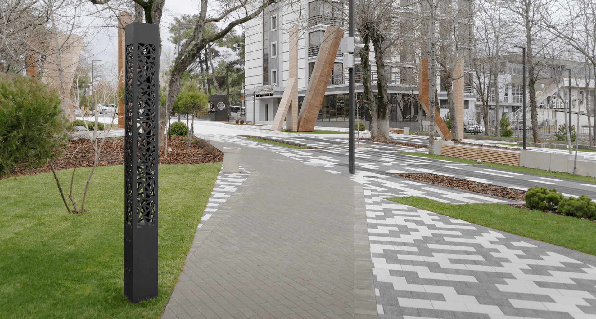 При реализации появилась необходимость в поиске альтернативы для высоких ландшафтных светильников с матовым рассеивателем из поликарбоната на светильники в стиле модернизм, обеспечивающие высокий визуальный комфорт для пешеходов и отсутствие светового загрязнения.