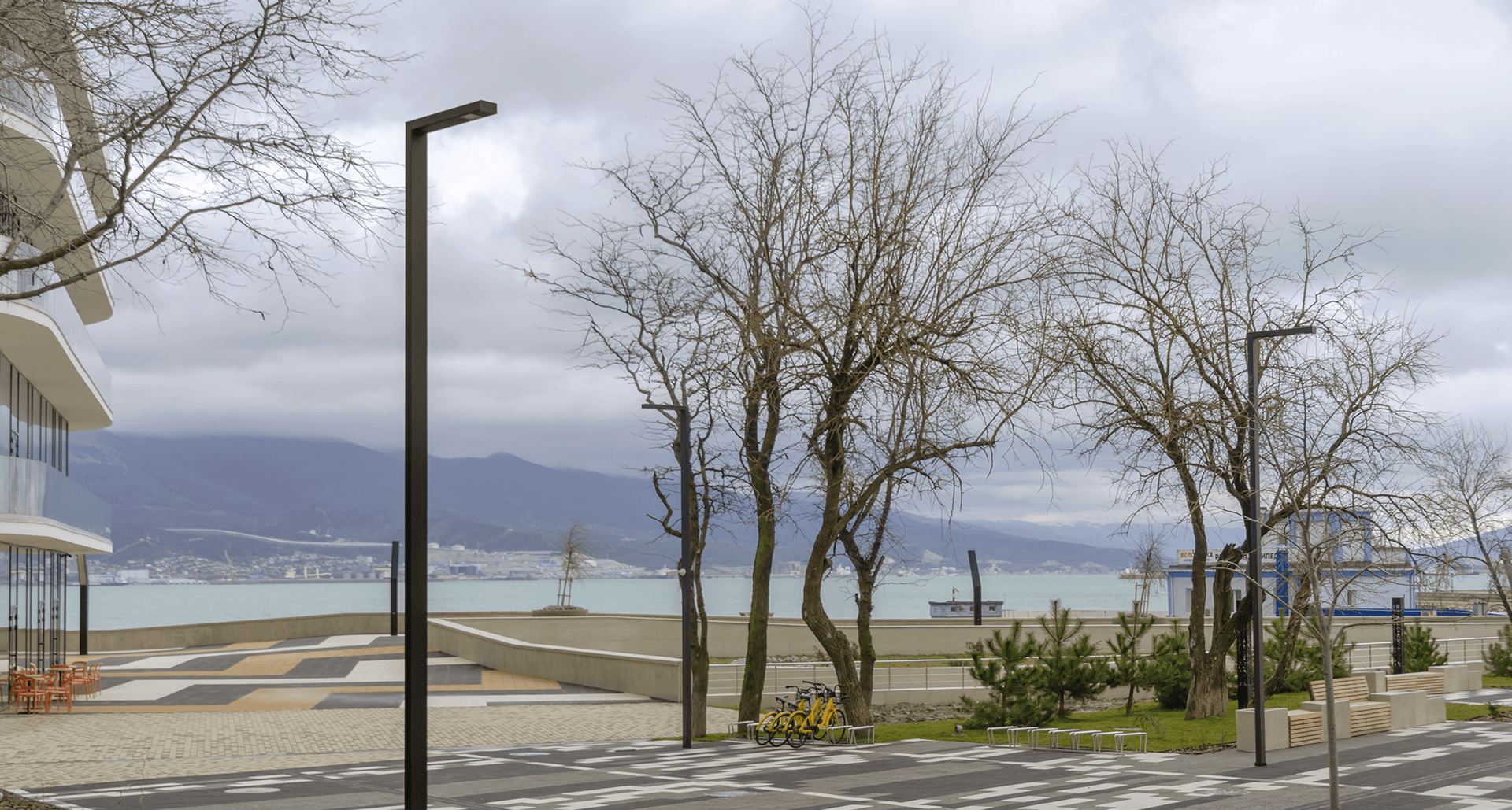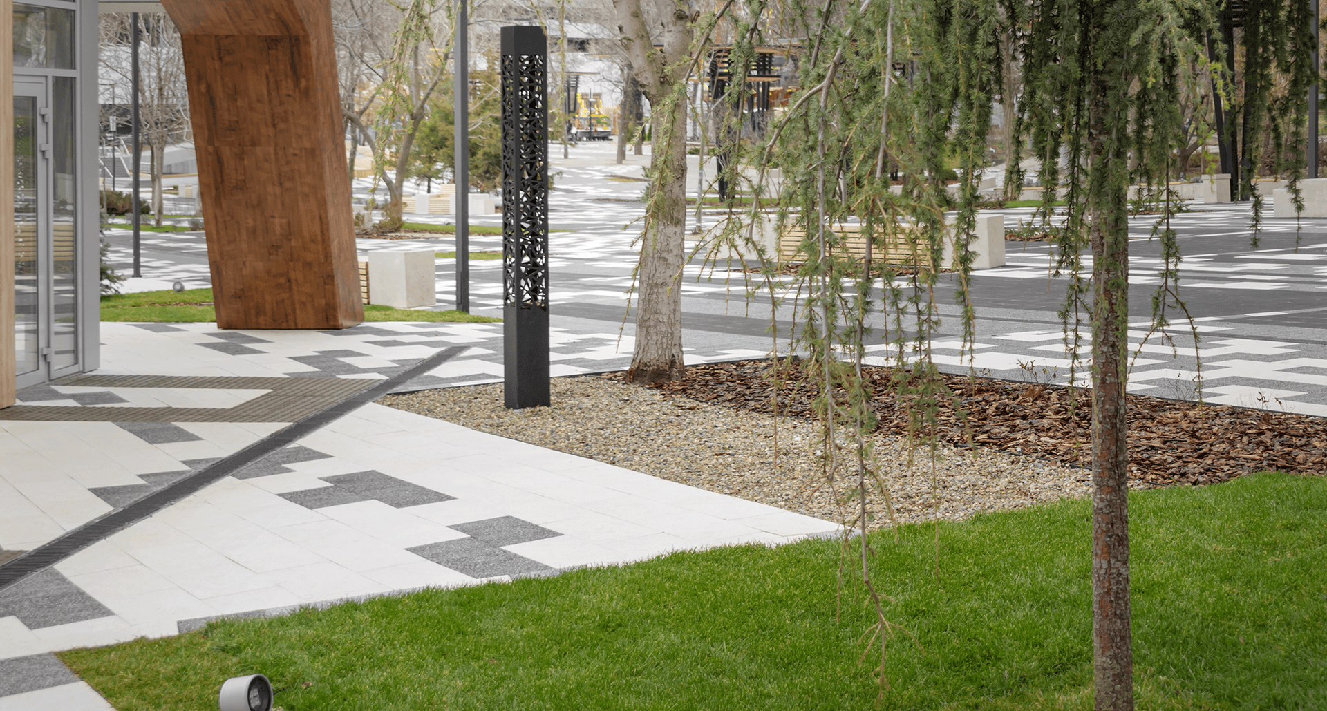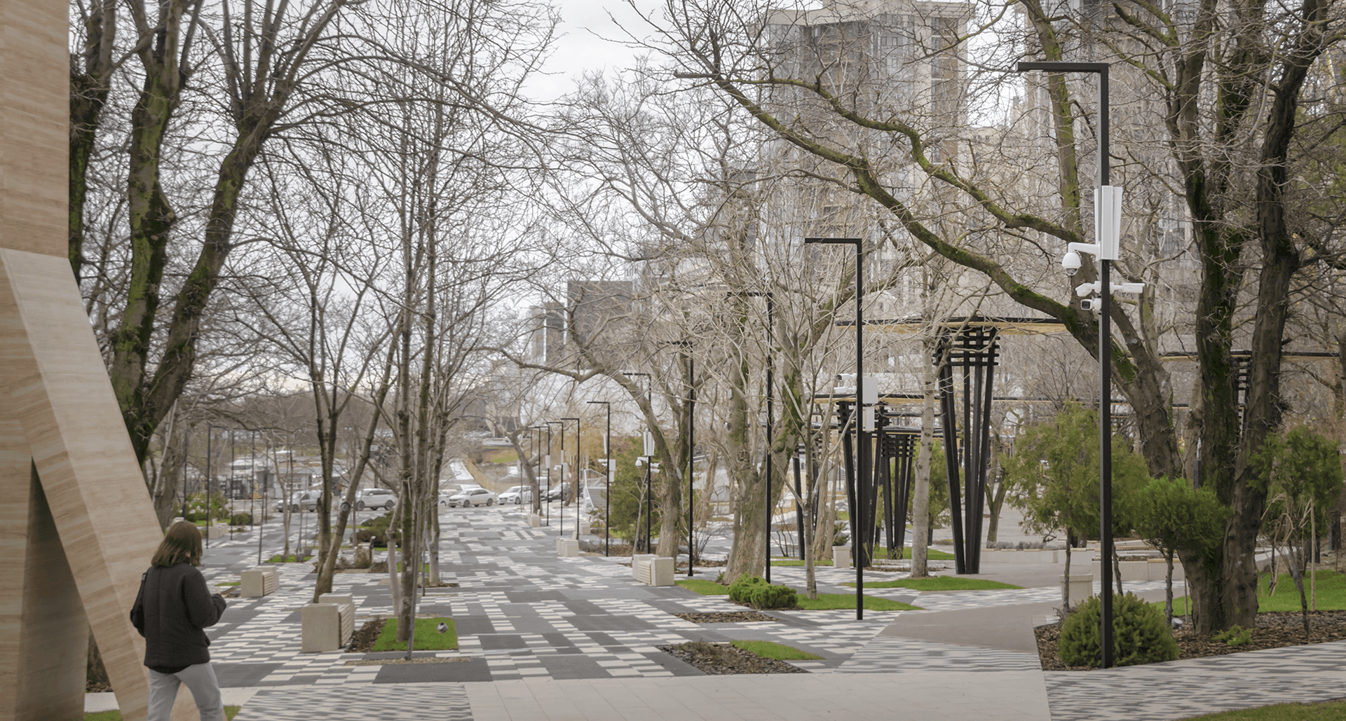 При реализации появилась необходимость в поиске альтернативы для высоких ландшафтных светильников с матовым рассеивателем из поликарбоната на светильники в стиле модернизм, обеспечивающие высокий визуальный комфорт для пешеходов и отсутствие светового загрязнения.