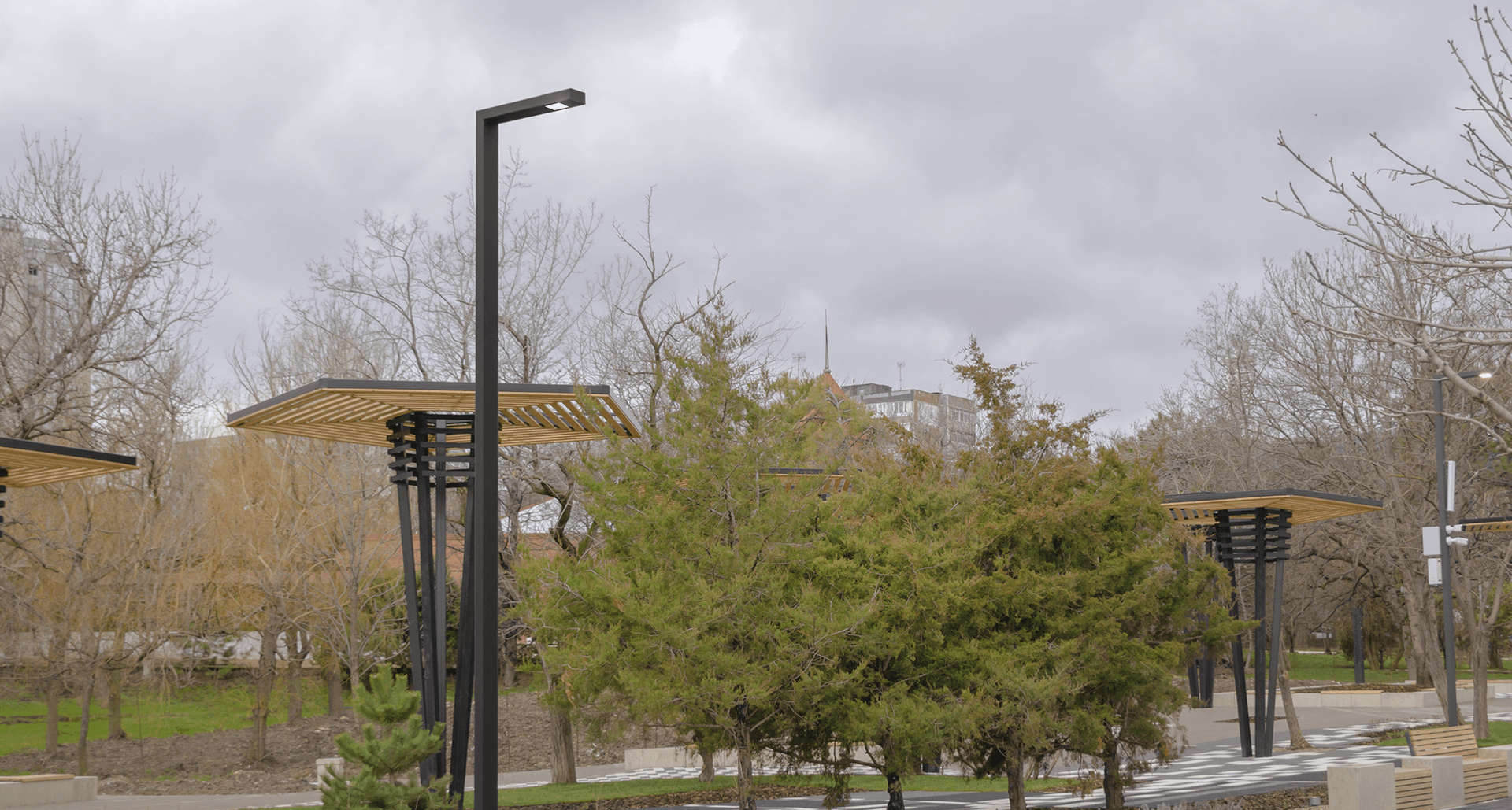 при реализации появилась необходимость в поиске альтернативы для высоких ландшафтных светильников с рассеивателем из поликарбоната. Идеальным решением стали уличные декоративные светильники TOWER LED, которые отлично смотрятся в любое время суток, а также минимизируют световое загрязнение парка.Также в проекте применены POKER LED и GLOSS LED 5 D100 4000K, которые гармонично вписались в ландшафт парка и дополнили идею архитектора.