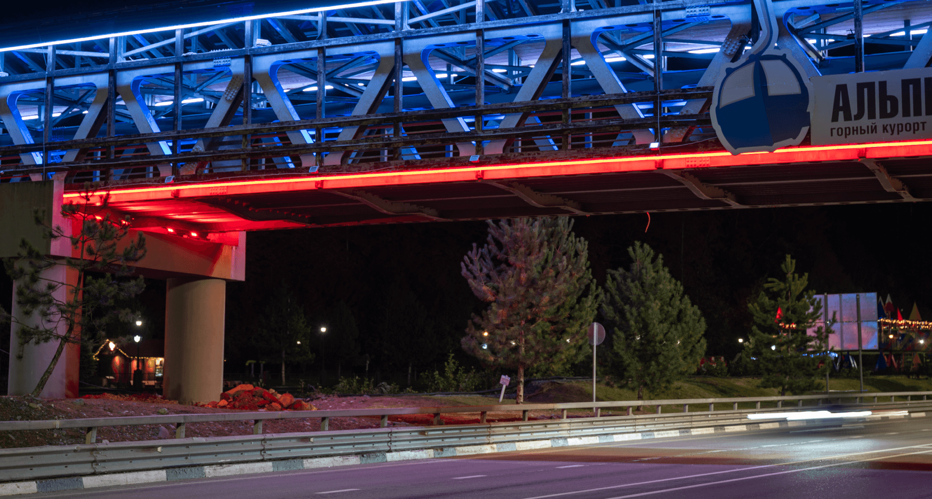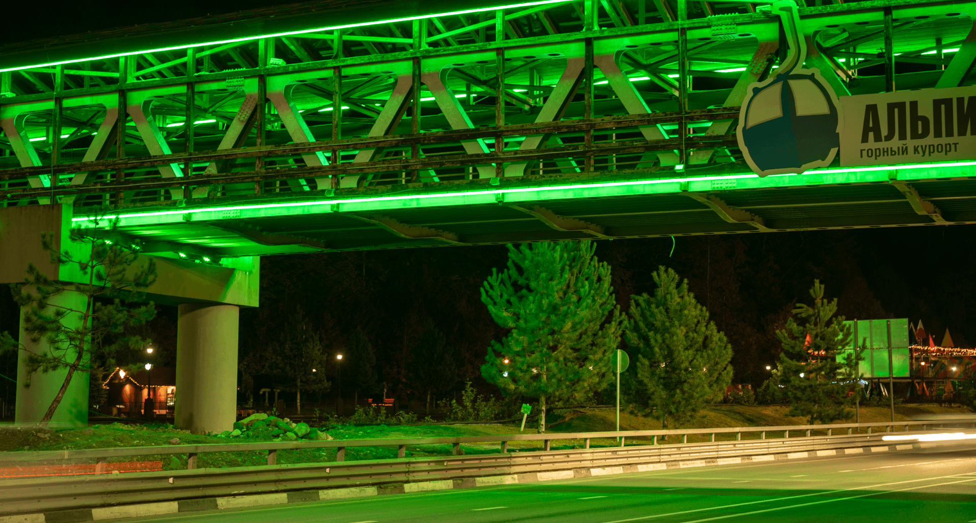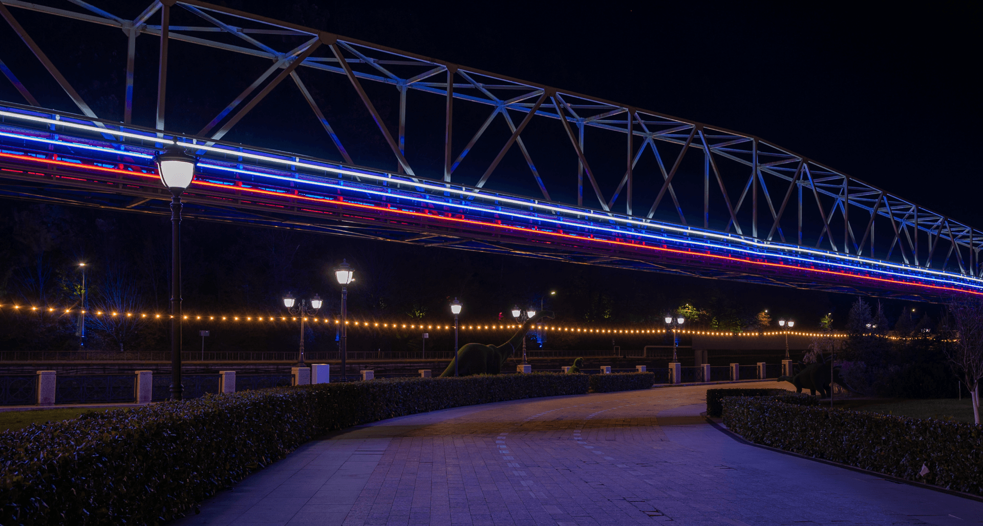 Компании “Световые Технологии” и IntiLed создали современную систему освещения для моста в парке Альпика. Решение включало в себя использование светильников IntiTUBE трех видов и VIZOR LED от IntiLed, а также систему управления, обеспечивающую плавную смену оттенков и динамичные режимы подсветки. Это позволило создать как спокойное, ненавязчивое освещение для будних дней, так и яркие, завораживающие переливы цвета для праздников, а также обеспечило дополнительную освещенность для проходящего под мостом шоссе.