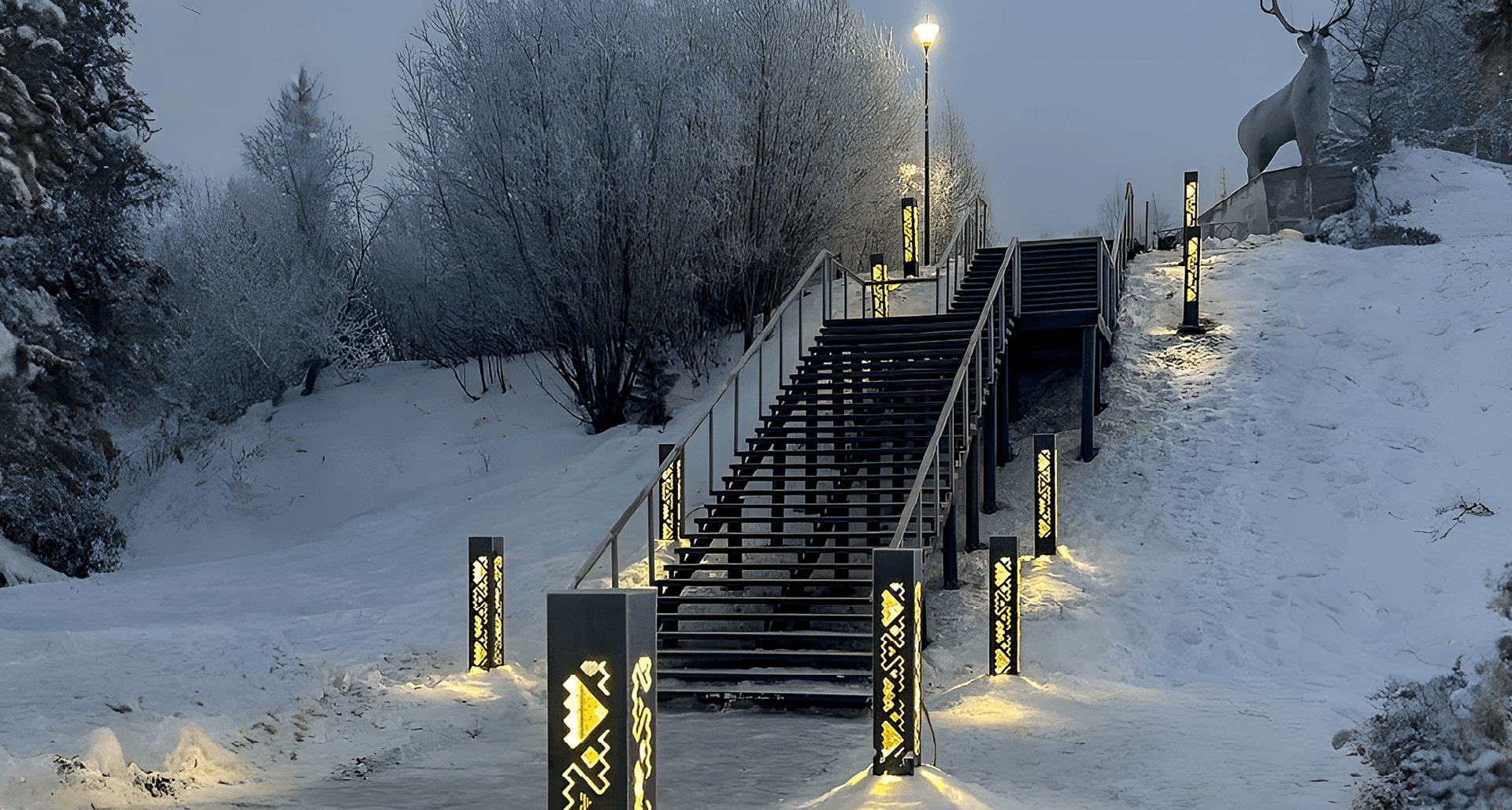 Для решения поставленной задачи были реализованы следующие светотехнические решения: вокруг памятника северному оленю установлены светильники APEX LED. Их равномерный мягкий свет подчеркивает величие скульптуры. На подходах к памятнику, вдоль дорожек и лестниц, размещены светильники TOWER LED, обеспечивающие не только комфортное освещение, но и являющиеся частью художественного оформления.