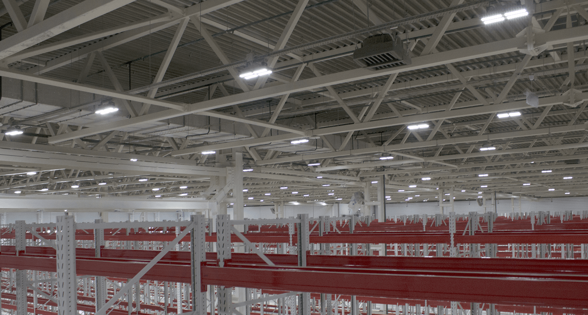 Предложить решение по освещению внутренних помещений и прилегающей территории (стоянка для автофур и подъездные пути к складскому терминалу). В связи с высокими потолками, требовались светильники с высотой подвеса не менее 12 м. Основное требование со стороны заказчика, чтобы вся система работала в автономном режиме по датчикам присутствия и поддерживала заданный уровень освещенности 250 люкс.