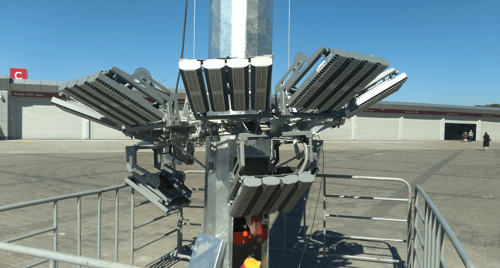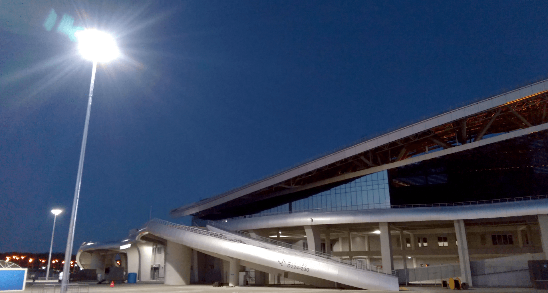 В результате проделанных работ было предложено для освещения прилегающей к стадиону территории установить мощные светильники прожекторного типа HB LED FLOODLIGHT. Поскольку высота установки светильников 12 метров, а прилегающая к стадиону территория достаточно обширна, то на каждой опоре было решено смонтировать светильники HB LED 400 c разными типами КСС, по 12 светильников на опоре. Для равномерности засветки между опорами и на прилегающей территории были применены светильники HB LED 400 D30 5000К, в количестве 9 шт. Для освещения выходов второго яруса и лестничных маршей использовались светильники HB LED 400 D60 5000К в количестве 2 шт. и один светильник HB LED 400 D80 5000K, дополняющий равномерность освещенности в самых отдалённых от стадиона участках. В качестве освещения проходов в подтрибунных помещениях использовались светильники LZ.OPL ECO LED 1200 TH 5000K. Полученная освещённость, полностью соответствует требованиям нормам освещённости и светотехническому проекту.