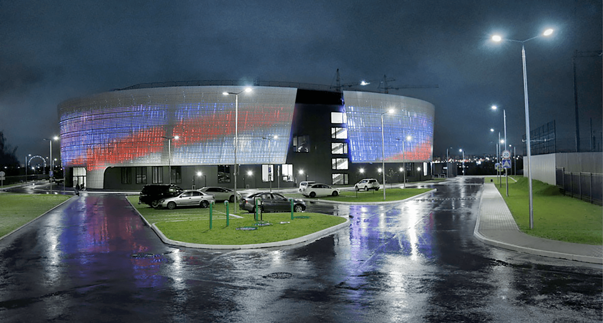 система освещения реализована на специальной модификации светильников HB LED 3x150 D60 5700K с повышенным CRI. Для подсветки трибун применены асимметричные прожектора LEADER LED 50 A30 5700K.В процессе работы мы столкнулись с неоднократными светотехническими расчетами, встречались с проектными бюро, заказчиками, монтажниками, процесс юстировки был выполнен специалистами "Световых Технологий" с привлечением команды опытных альпинистов.Обеспечены не только показатели освещенности на главную и второстепенную камеры, но и высочайшие показатели равномерности (Emin/Eav не менее 0.80; Emin/Emax - не менее 0.60) и, как бонус, 5 режимов освещения:1. соревнования с ТВ-трансляцией (Eкам не менее 1500 лк)2. местные соревнования3. тренировка4. уборка5. аварийный режим