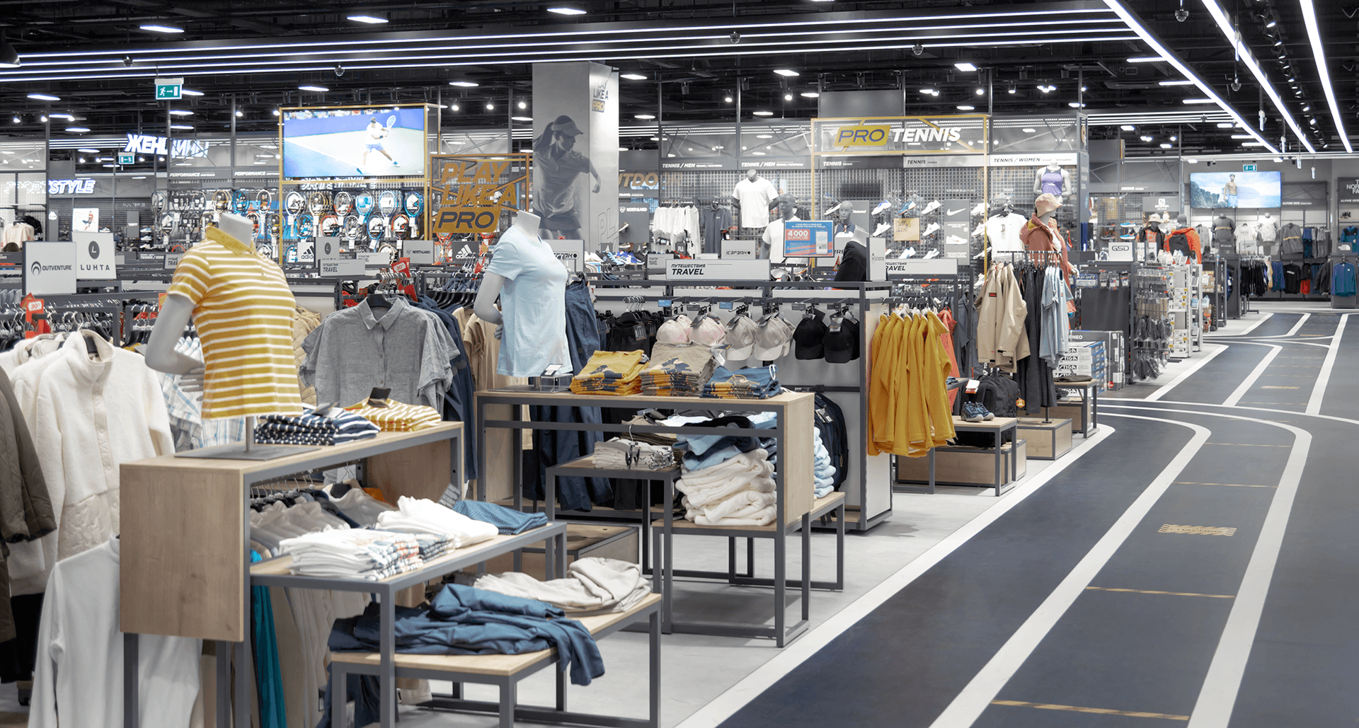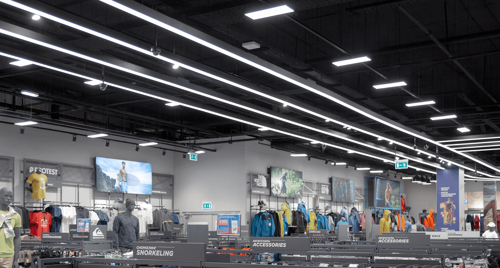 Основная задача - создание осветительной установки, которая с одной стороны максимально интегрируется и подчеркнёт обновленный премиальный формат торгового зала ГМ «Спортмастер», а с другой стороны решит ключевую задачу новой концепции магазина - «свет на товар, а не на пространство». И, конечно, заявленные требования должны были быть реализованы не в ущерб качественным параметрам света и комфорту световой среды, а также с соблюдением всех требований по энергоэффективности.