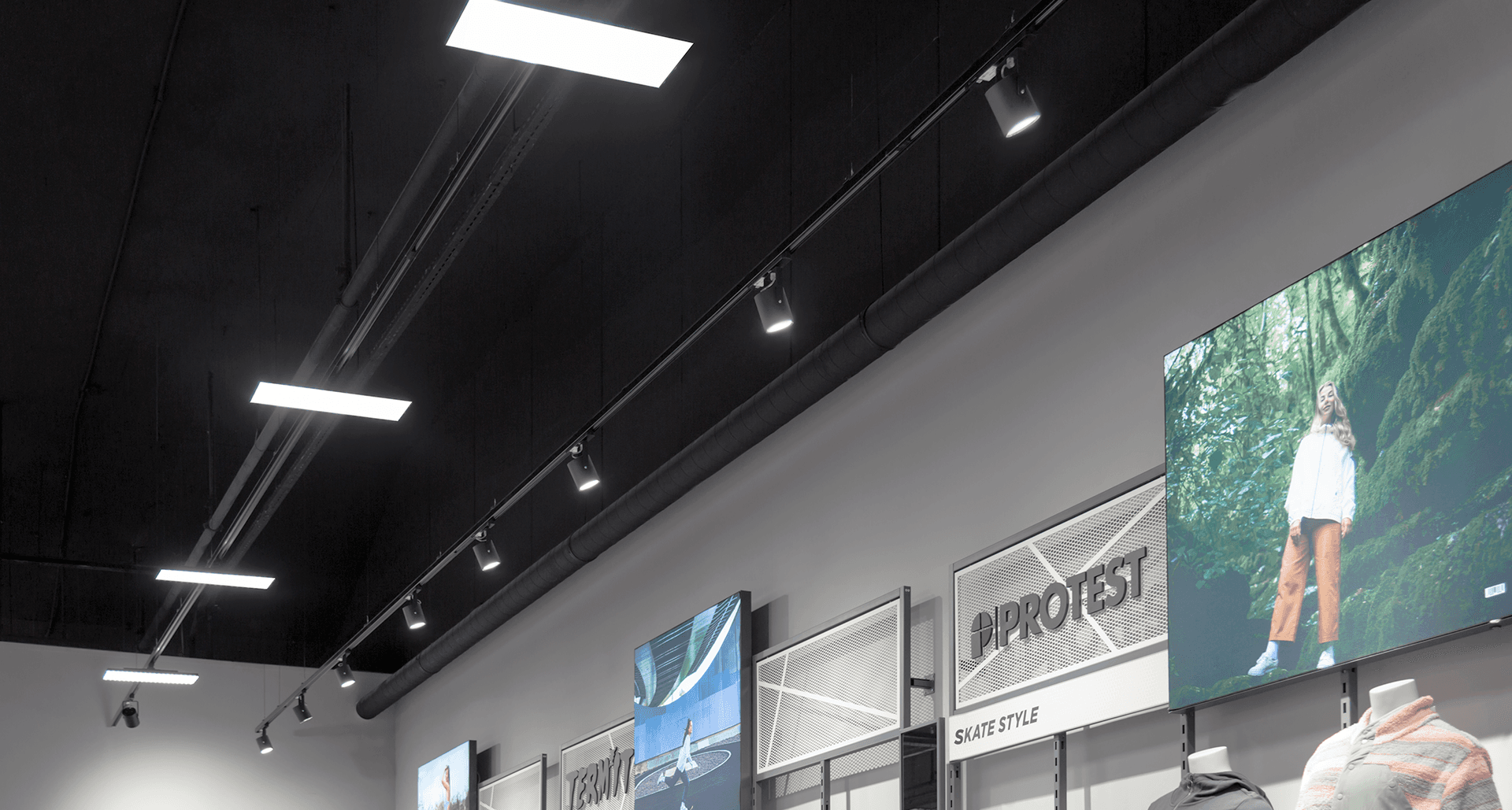 Общее заливающее освещение торгового зала линейными магистральными светильниками сменилось на более направленную подсветку товаров и манекенов с использованием большего числа приборов акцентирующего освещения -- ARMA/T и светодиодных панелей на шинопровод - DOMINO LED PANEL/T, которые имеют возможность гибко подстраиваться под геометрию торгового зала и расстановку торгового оборудования.