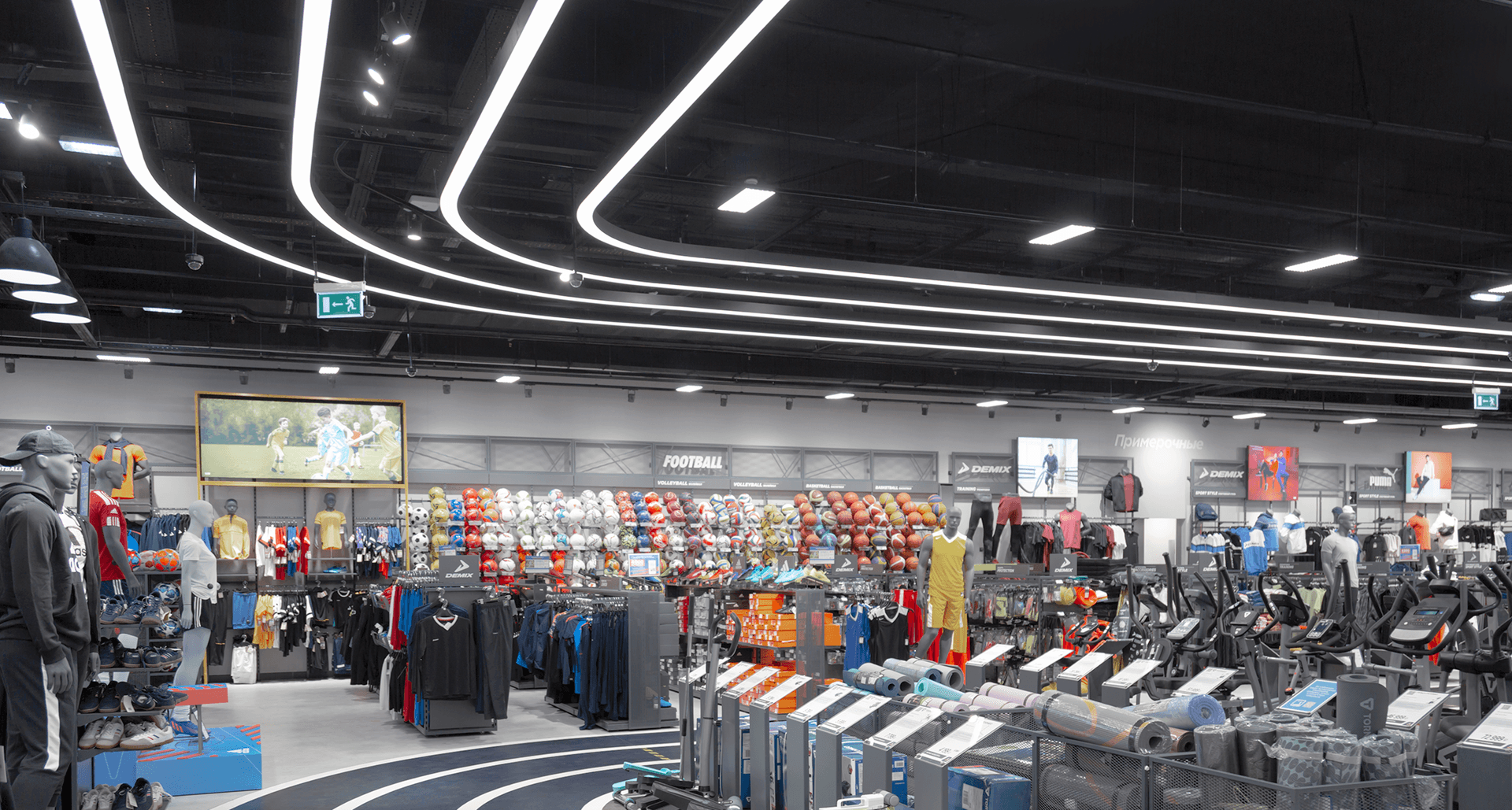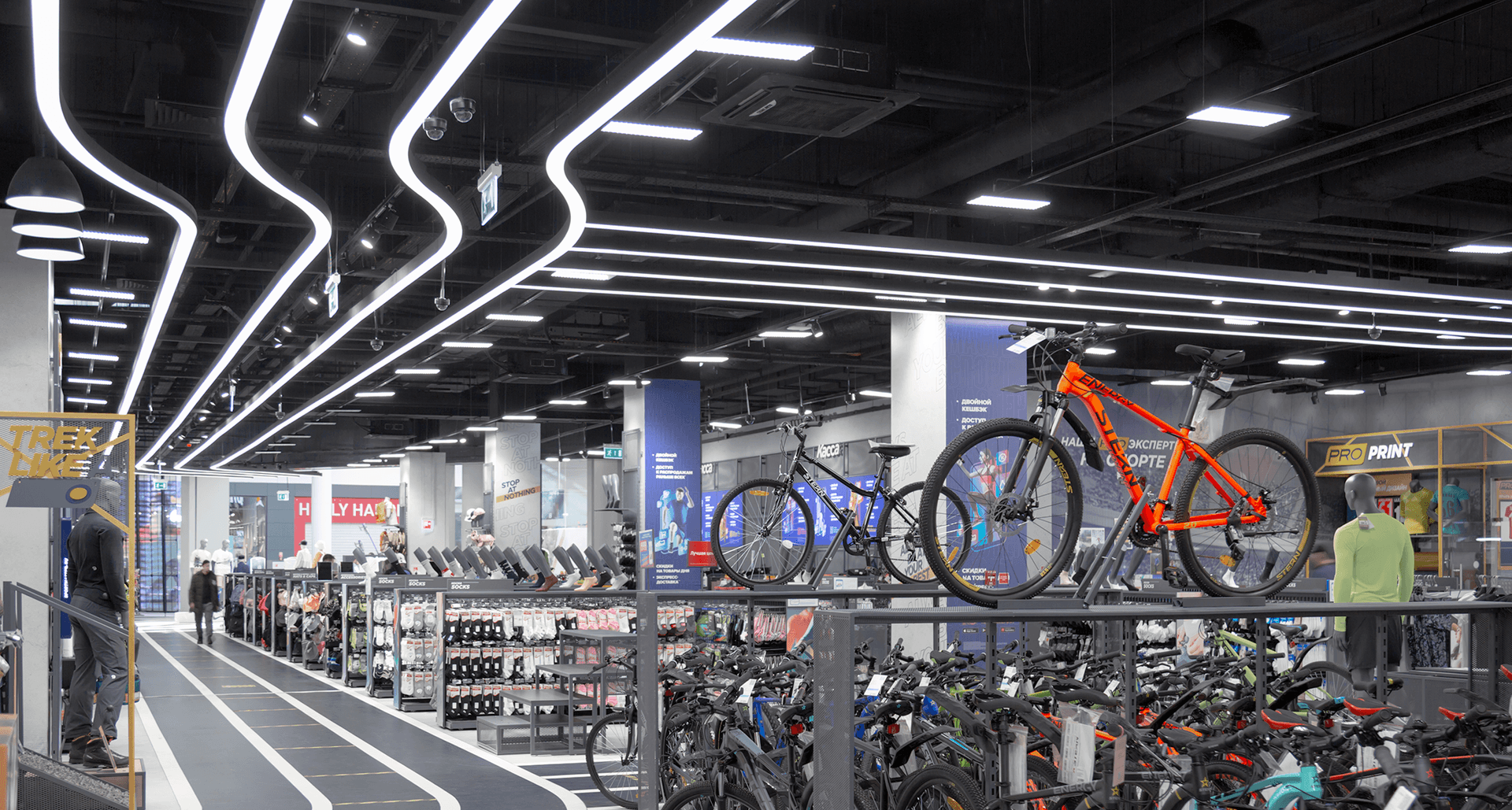 Основная световая доминанта торгового зала - световая дорожка, зеркально отражающая разметку беговой дорожки на полу супермаркета. Кастомизированное решение для этой задачи разработаволось экспериментаьным цехом LT специально под тот проект.