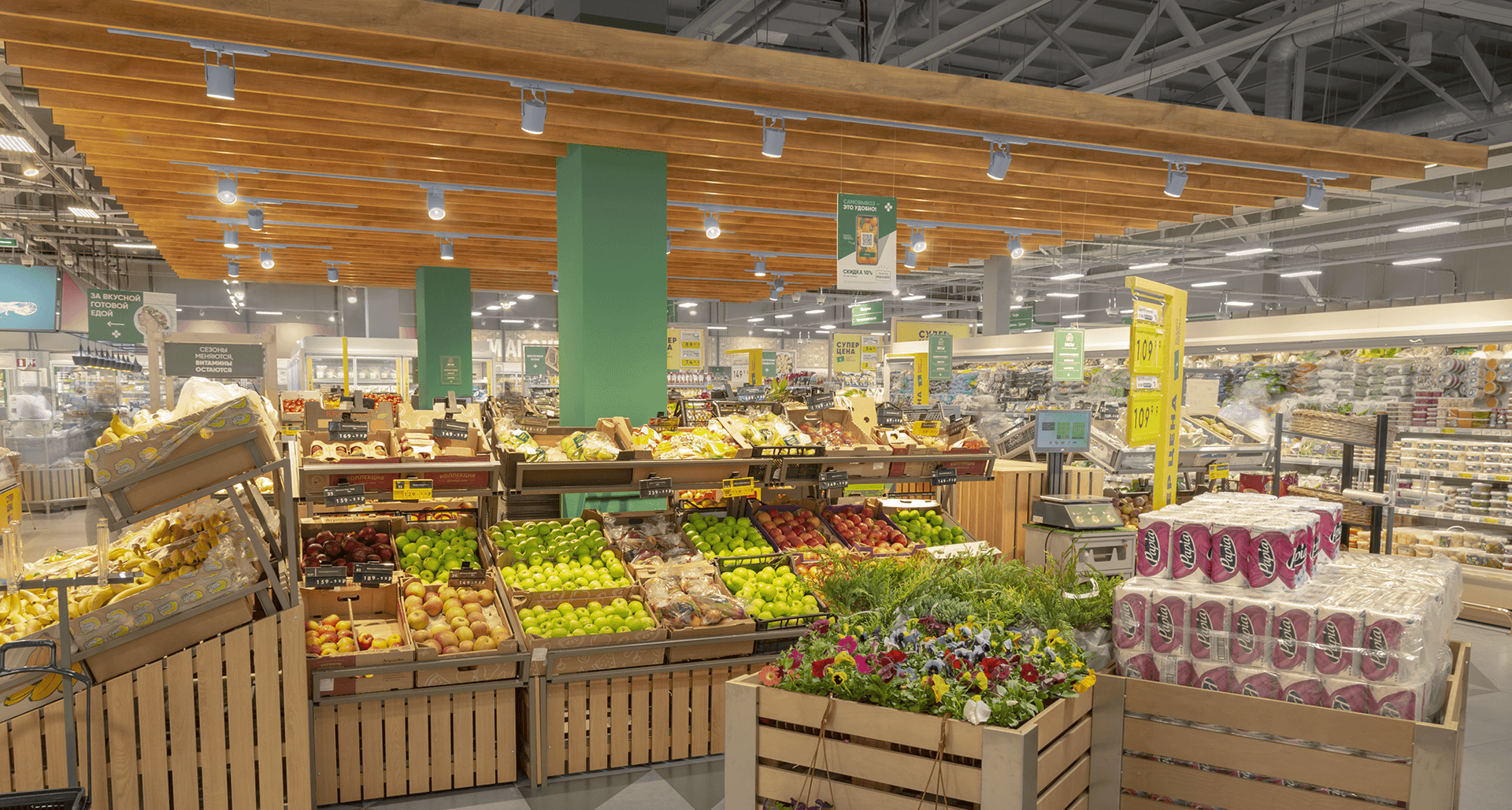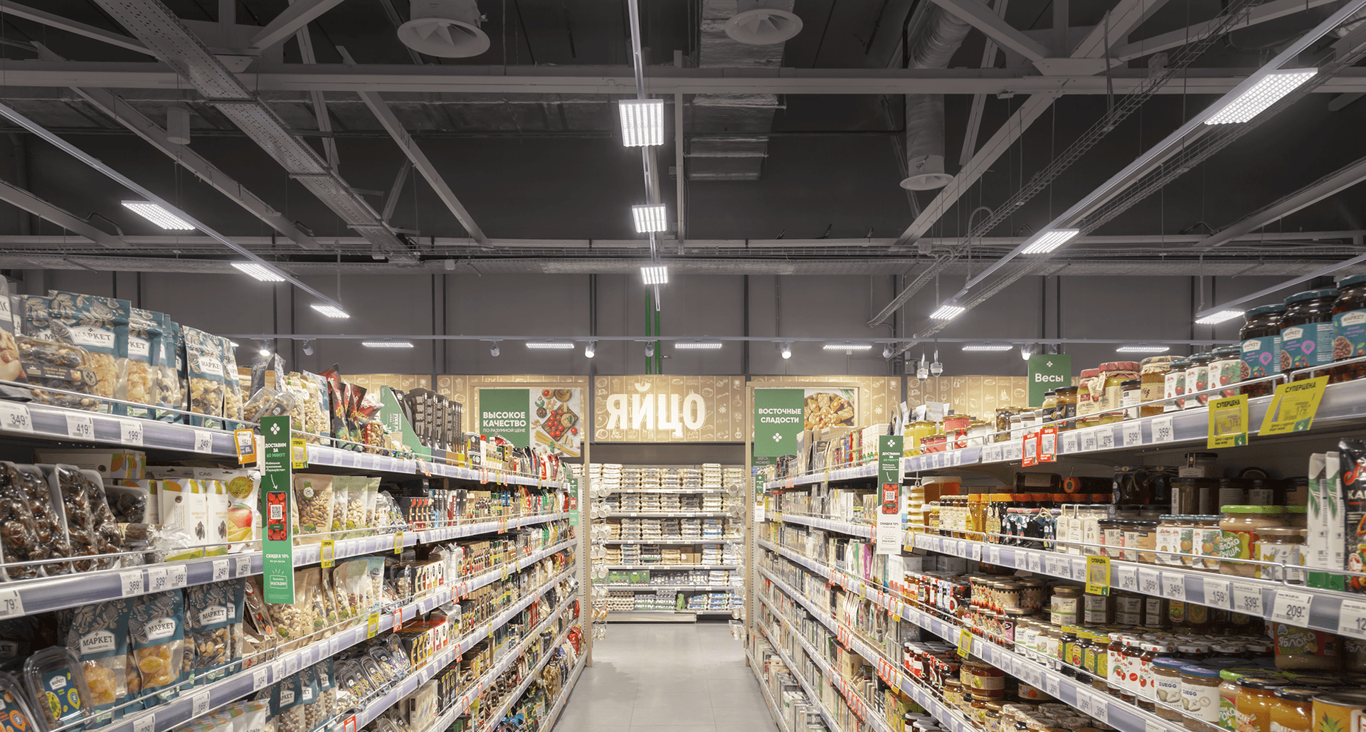 Под магазины сети разработан концепт-план освещения всех зон торговой площади с испоьзовнием световых пиборов LT. Для освещения зон касс и проходов использовались трековые светодиодные панели DOMINO LED PANEL/T с оптикой собственного производства: D90 и двойной ассиметричной . Зоны акцентирования освещены с помощью светильников ARMA/T. Спектральные арактеристики световых приборов выбирались с учетом особенностей товарных групп: для зоны овощей и фруктов использовалась КЦТ 3000К с индексом цветопередачи >90, для освещения зоны выпечки была выбрана КЦТ 2700К, мясной отдел освещался световыми приборами со специальным спектром с пиком в красной области, чтобы сделать акцент на свежести красного мяса.Слаженная работа команды LT принесла свет в десятки магазинов сети. Обратите внимание на освещение, когда в следующий раз отправитесь за покупками.