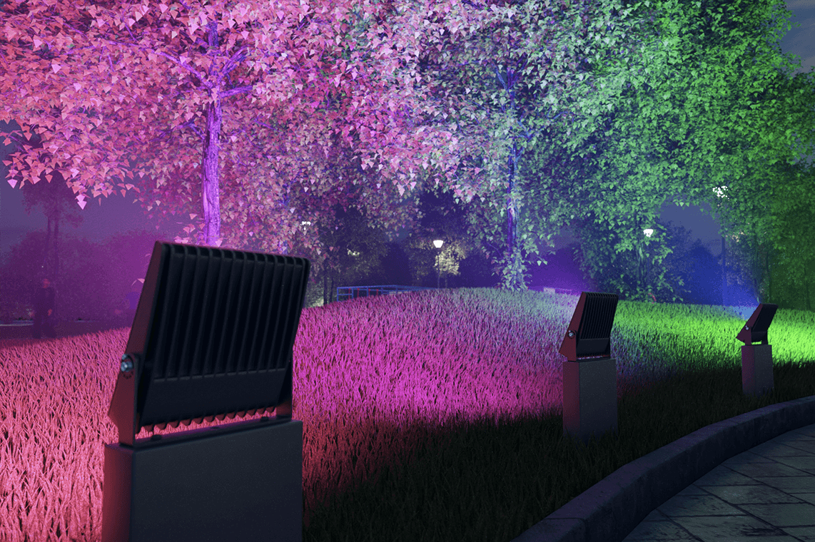 Яркие акценты в ландшафтном освещении - очевидный тренд современности. Свет, пробуждающий эмоции, влияет на настроение человека. Цветное освещение деревьев придает современный вид парку и создает целый сказочный мир, привлекающий к себе больше внимания.