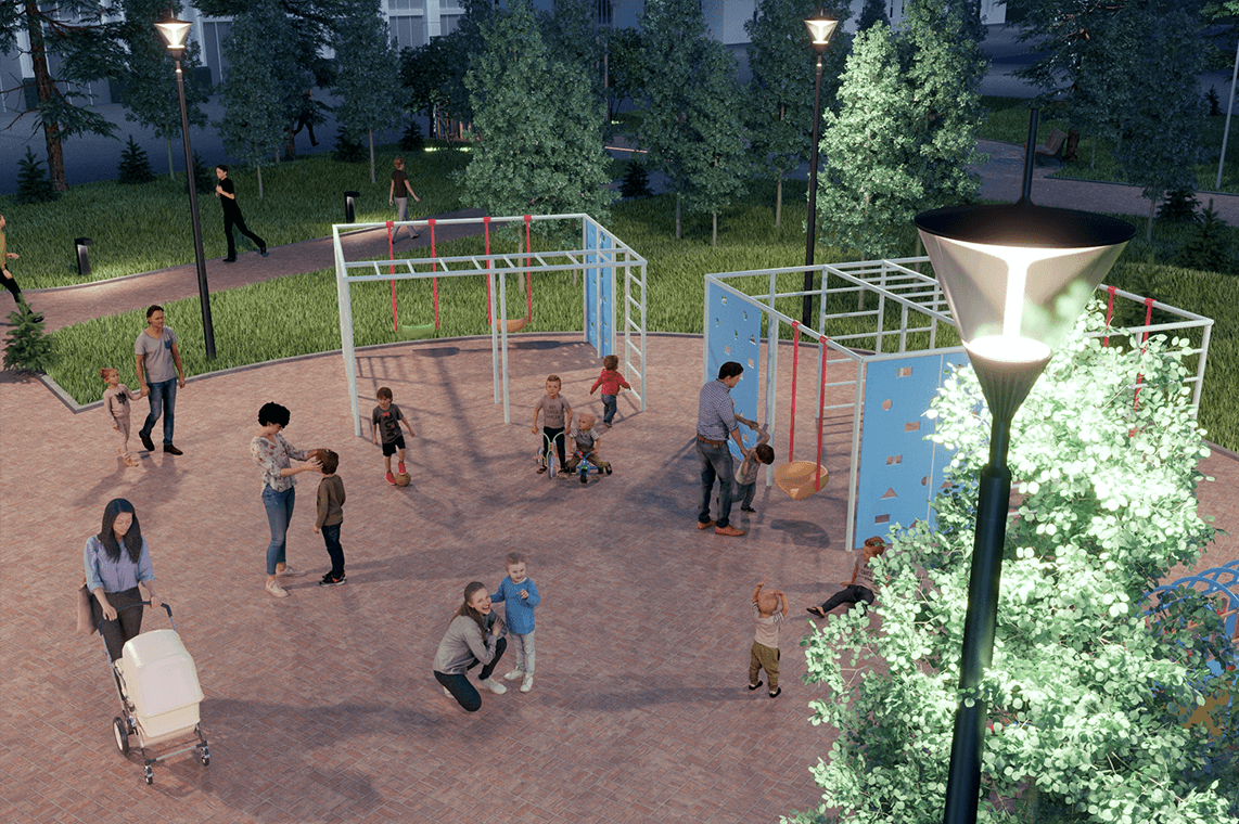 Освещение на детских площадках играет важную роль в обеспечении безопасности. Светильники, располагающиеся вдоль дорожек, создают направленный свет без резких контрастов для комфортного времяпрепровождения взрослых и детей. Освещение на детских площадках должно создавать благоприятную и безопасную атмосферу. Светильники со стопроцентным отраженным светом исключат травмы глаз самых маленьких жителей в колясках. При выборе уровня освещенности и контраста не забываем и про тех, кто рядом с малышами.